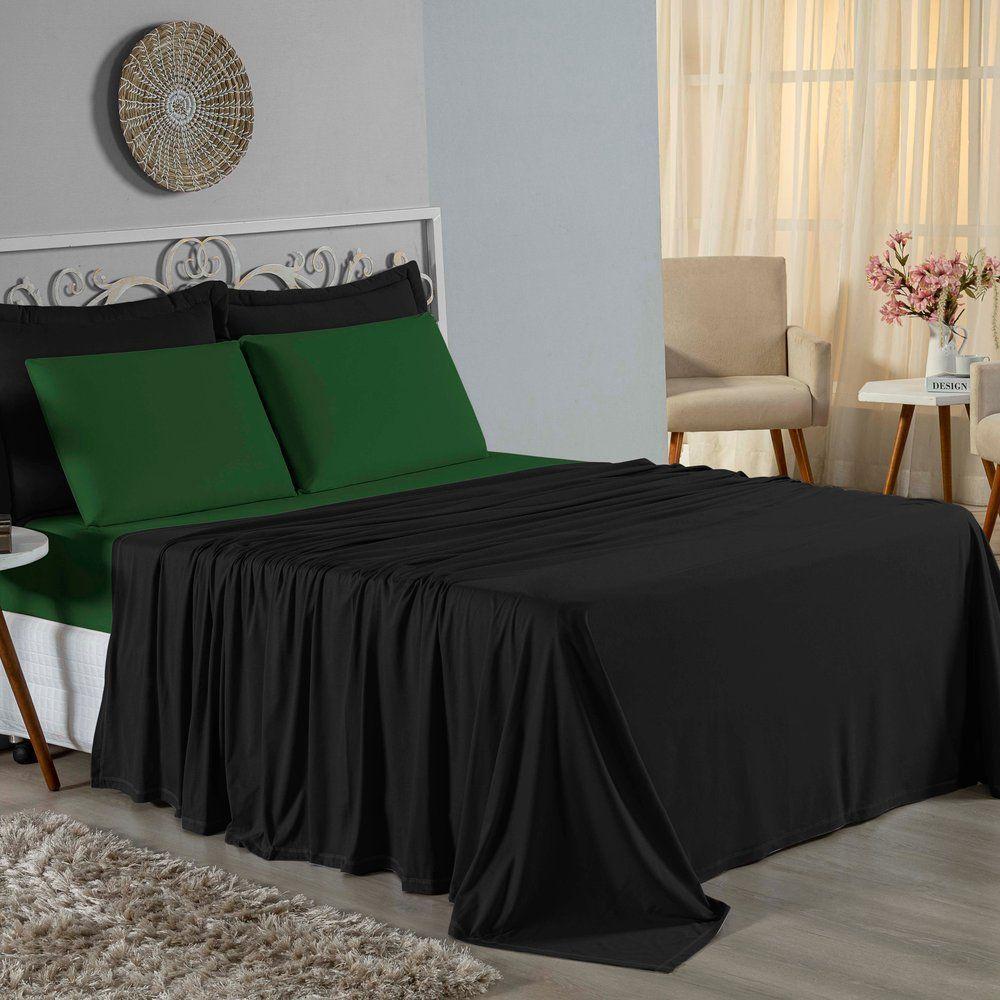 Jogo De Cama Casal Nobre 4 Peças Lençol Com Elástico De 30cm De Altura Malha 100% Algodão - Preto / Verde-bandeira