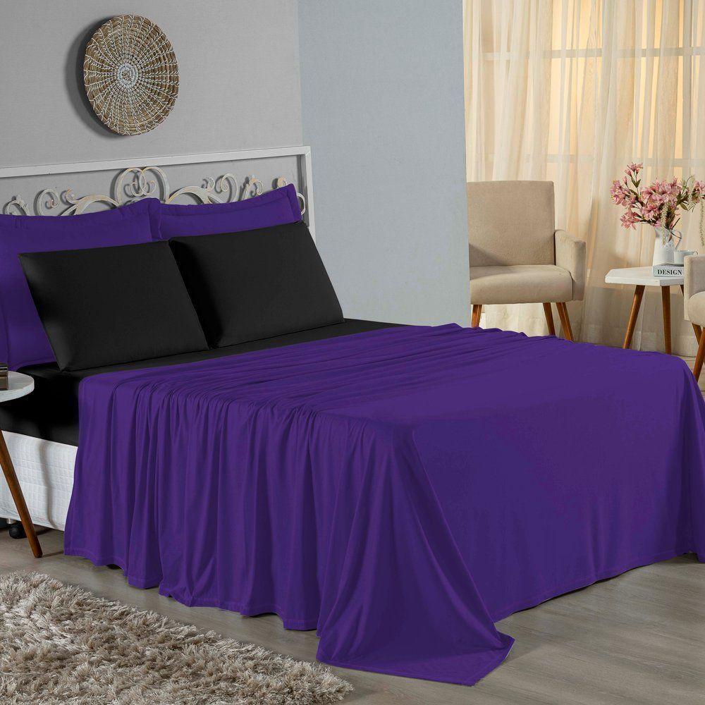 Jogo De Cama Queen Nobre 4 Peças Lençol Com Elástico De 30cm De Altura Malha 100% Algodão - Roxo / Preto