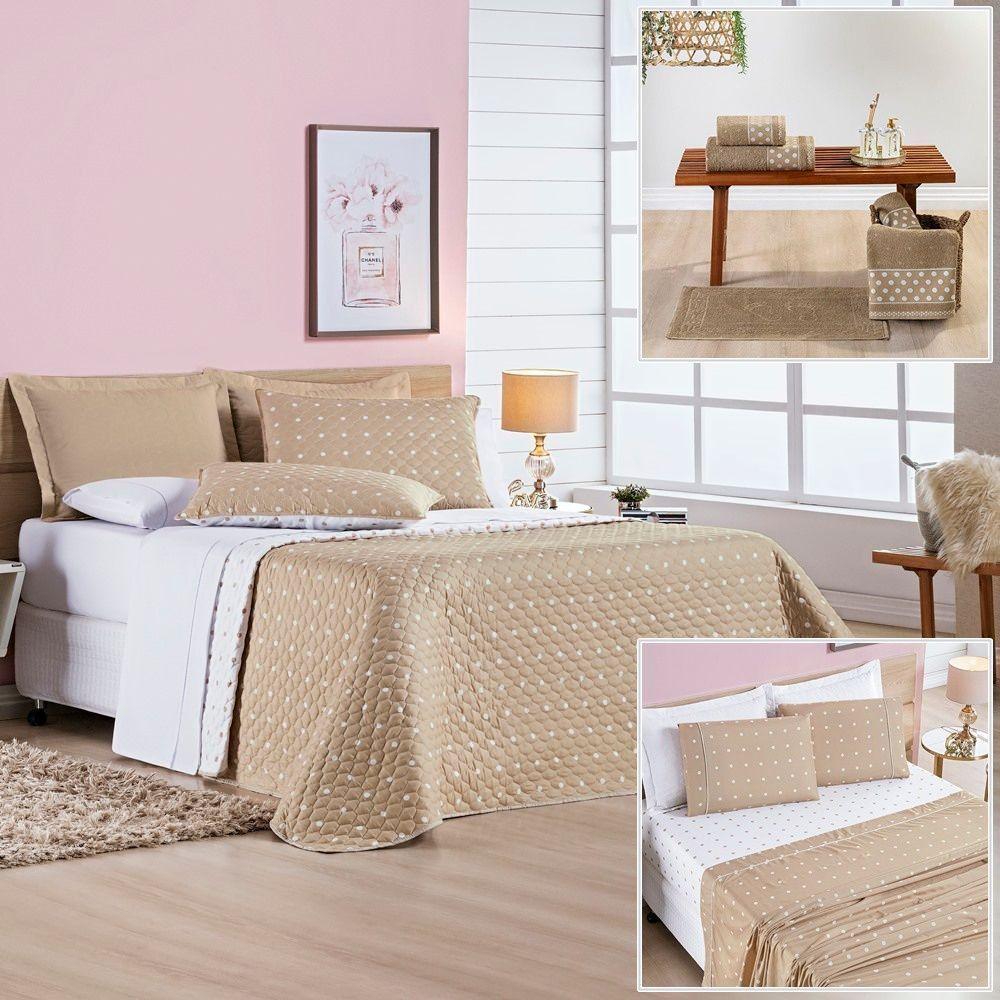 Cobre Leito + Jogo De Cama Queen + Jogo De Banho Petit Poá 12 Peças 100% Poliéster - Caqui