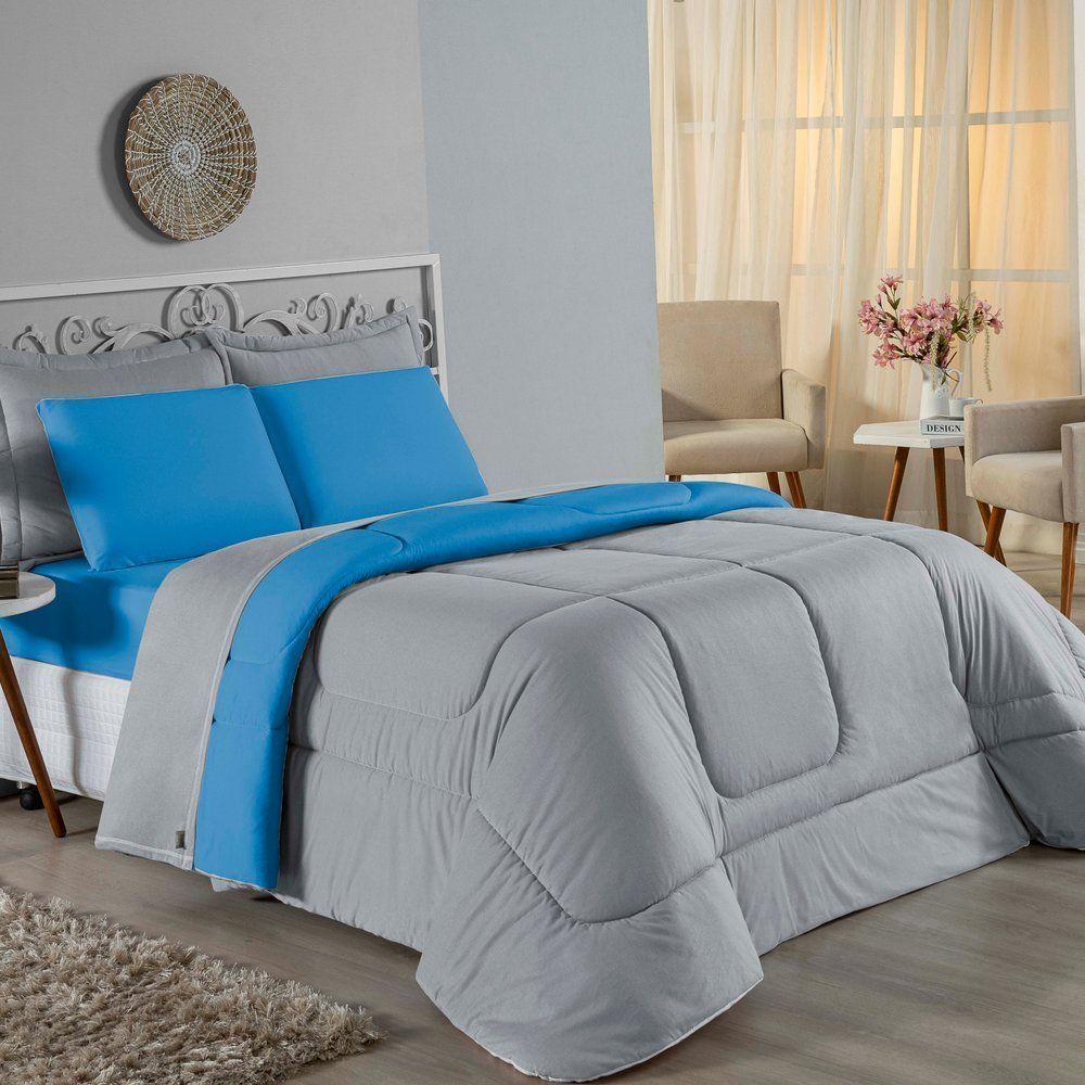 Kit Edredom Dupla Face + Jogo De Lençol Casal Viúva Nobre 7 Peças Malha 100% Algodão - Cinza / Turquesa