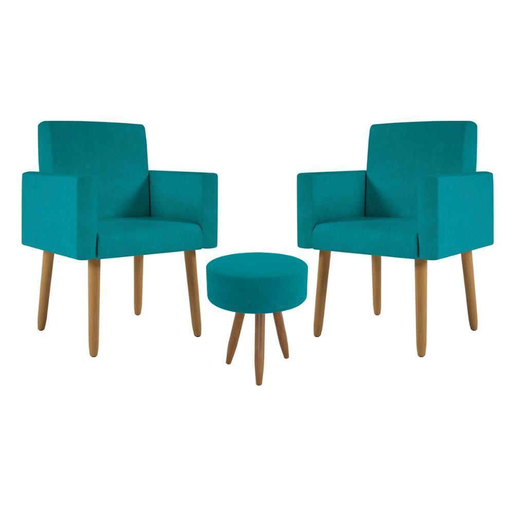Kit 2 Poltronas Cadeira Recepção Nina Com Puff Balaqui Decor Azul Turquesa