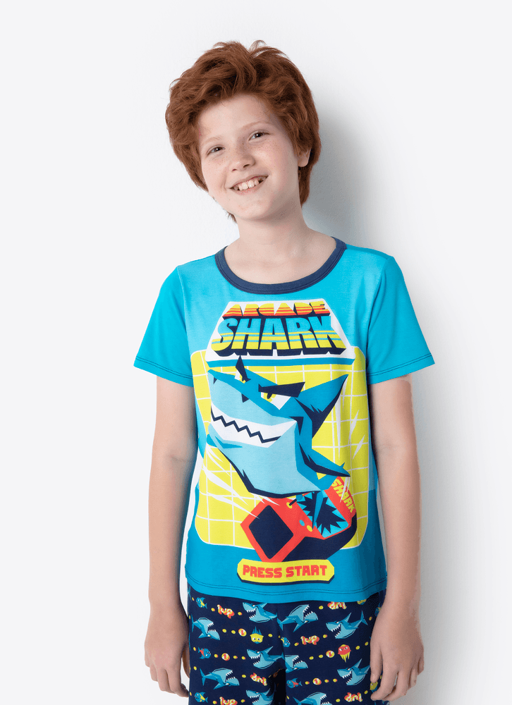 Pijama Manga Curta Menino Teen Viscolycra Tubarão Gamer