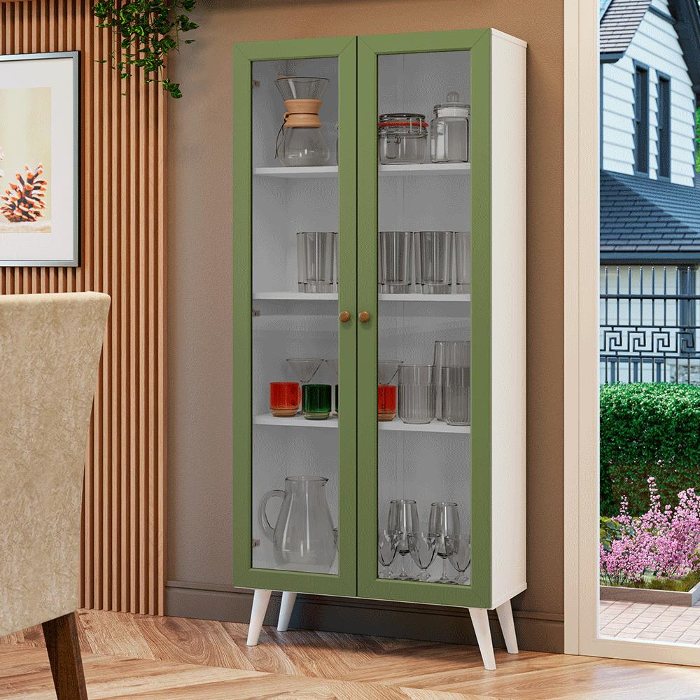 Cristaleira 70 cm 2 Portas de Vidro com Pés Cônicos Branco/Verde/Branco Vik Madesa