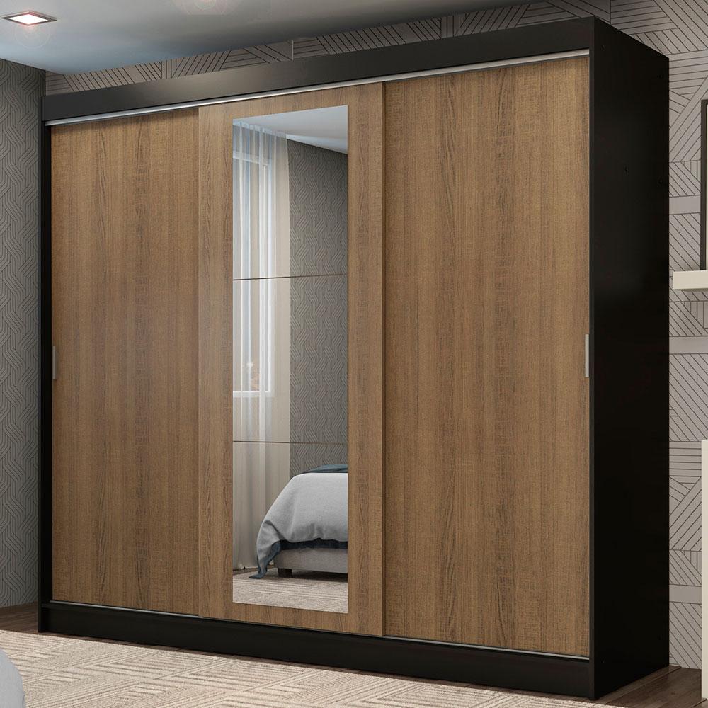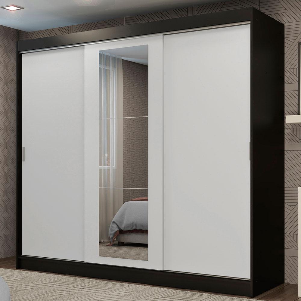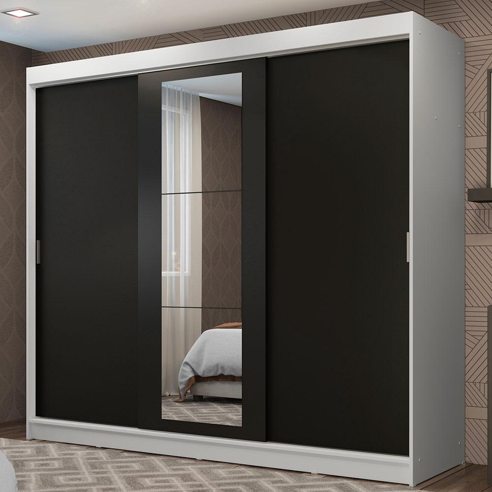 Guarda-Roupa Casal Madesa Kansas 3 Portas de Correr com Espelho 3 Gavetas - Branco/Preto