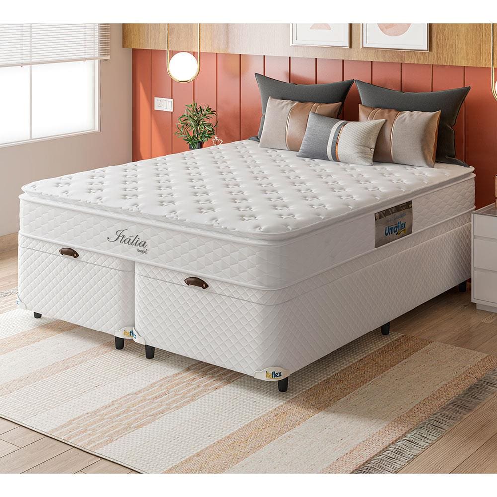 Cama Box Queen Size com Colchão Umaflex Itália e Base Itaflex Universal com Pillow Top, Molas Ensacadas e Baú - Branco