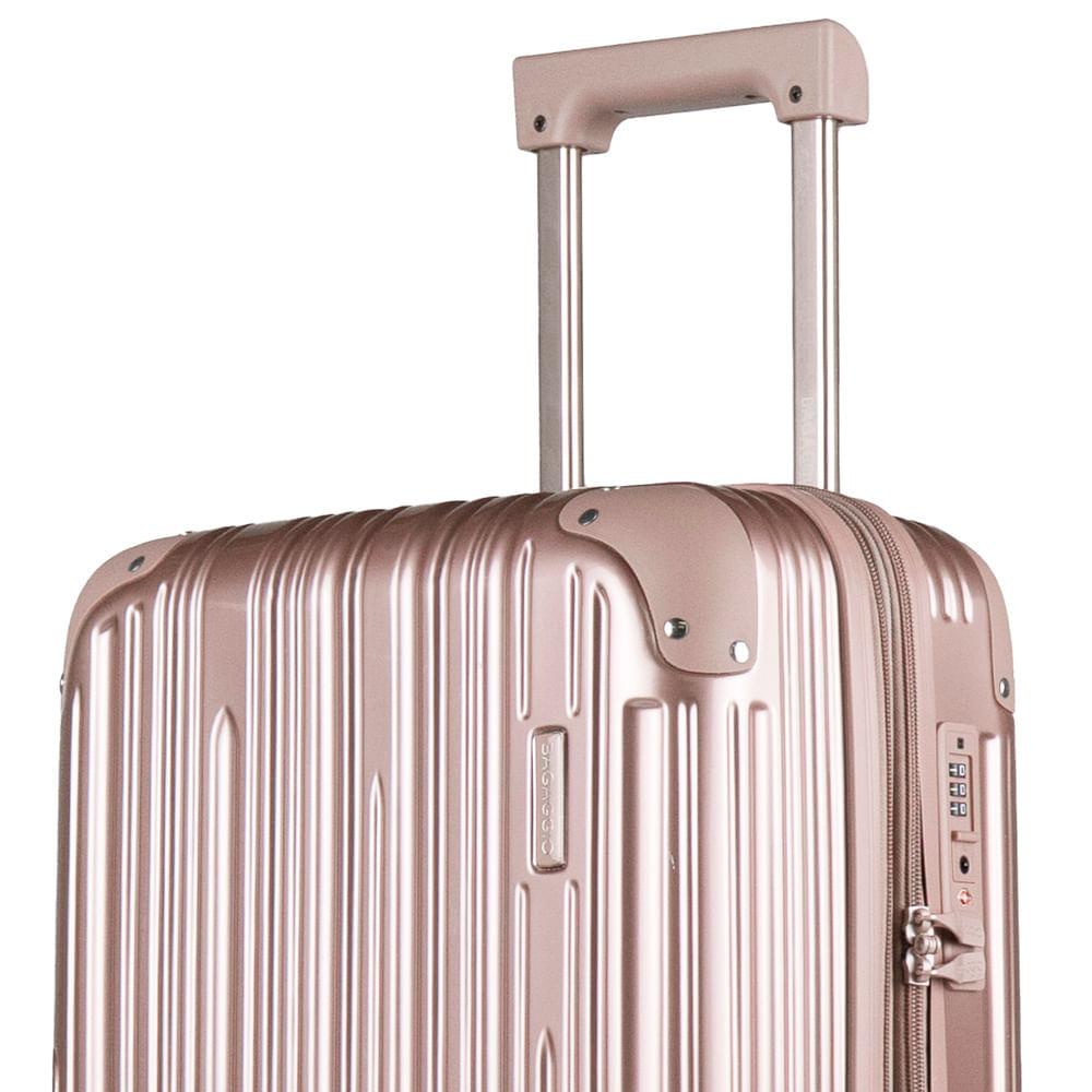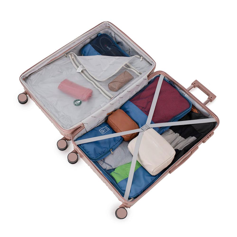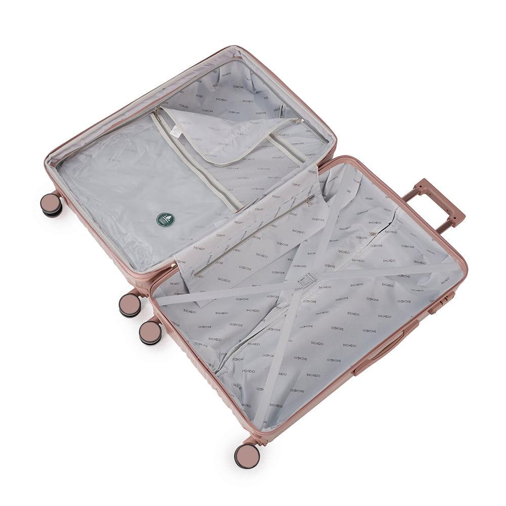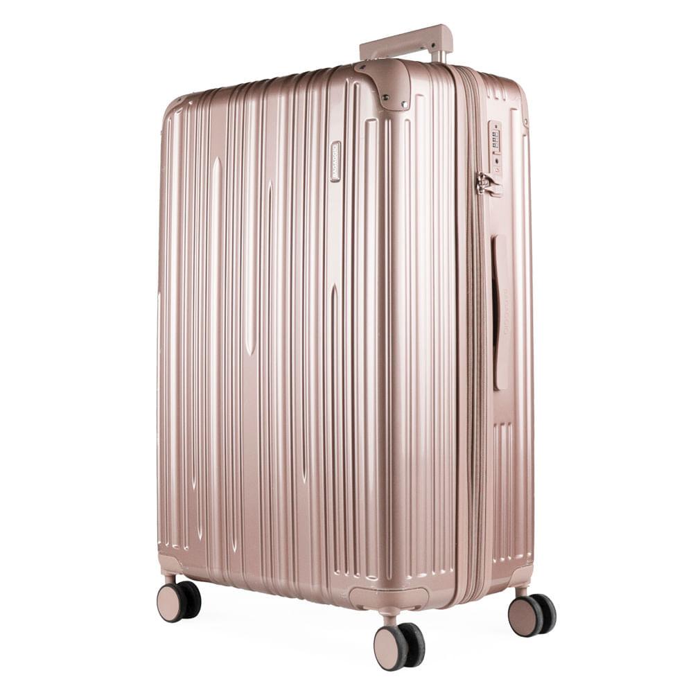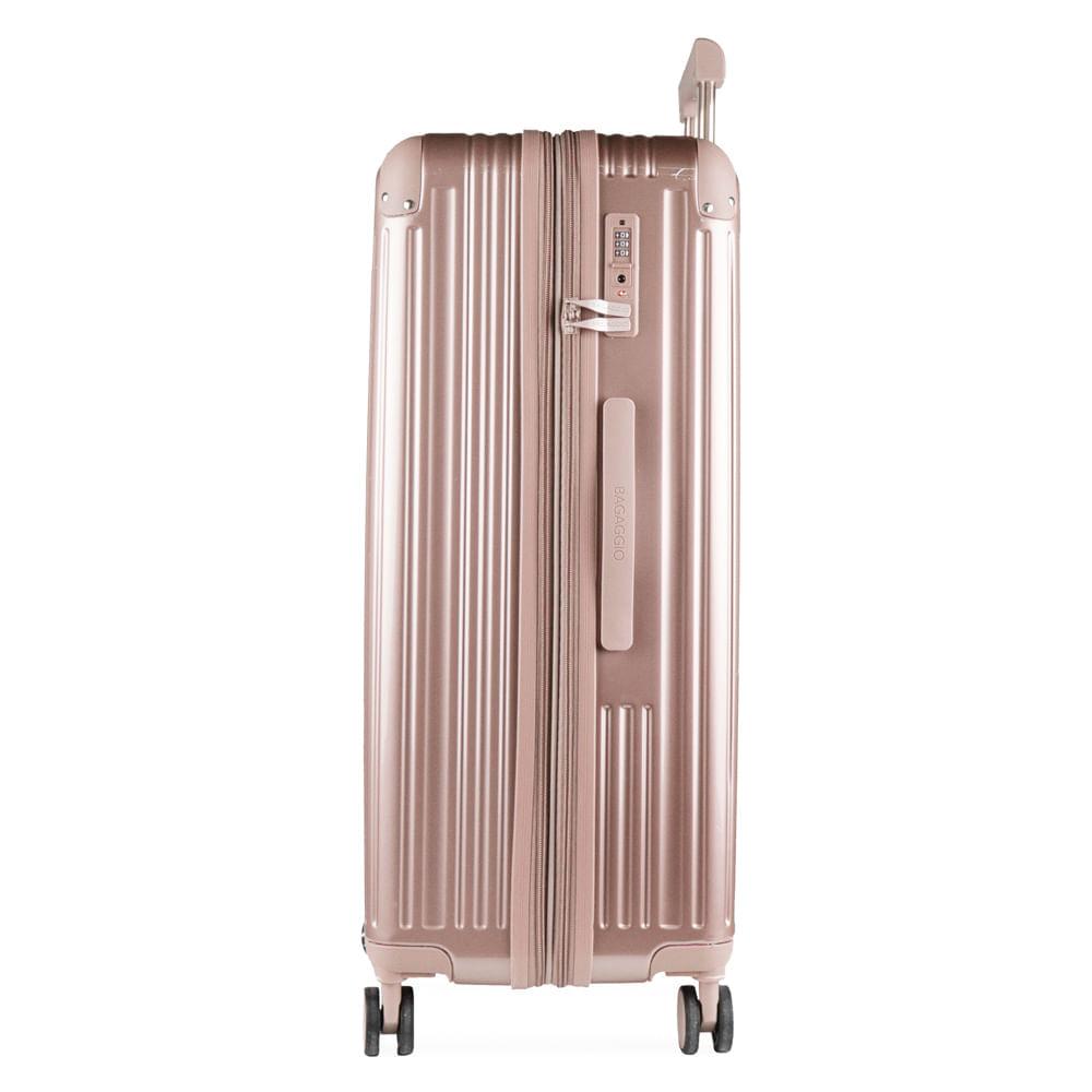 Mala Grande 32 kg Policarbonato Monte Carlo RoséZiper Expansível: Zíper Expansível O zíper expansível faz com que a mala de viagem ganhe alguns centímetros de espaço extra, perfeito para acomodar itens a mais.Cadeado TSA: Cadeado TSA A melhor opção para proteger sua bagagem em voos internacionais. Os cadeados TSA possuem abertura para uma chave universal, assim, a segurança do aeroporto consegue abrir o cadeado e inspecionar a bagagem sem precisar estourar o cadeado e danificar sua mala.Rodas 360º: Rodas 360° As rodas com giro 360º facilitam o deslocamento da mala de viagem, fazendo com que ela possa ser conduzida em qualquer direção, sem precisar incliná-la e sem fazer esforço.Especificações: Material: Policarbonato Peso (kg): 5,11 kgDimensões: 77 x 50,5 x 31,5 cmCapacidade: 122 LCor: Rosé Marca: BagaggioFaixa Etária: Adulto Outros atributos: - Rodas 360°.- 4 Rodas. - Espaço interno com cinta organizadoras. - Cadeado TSA. - Divisórias interna.