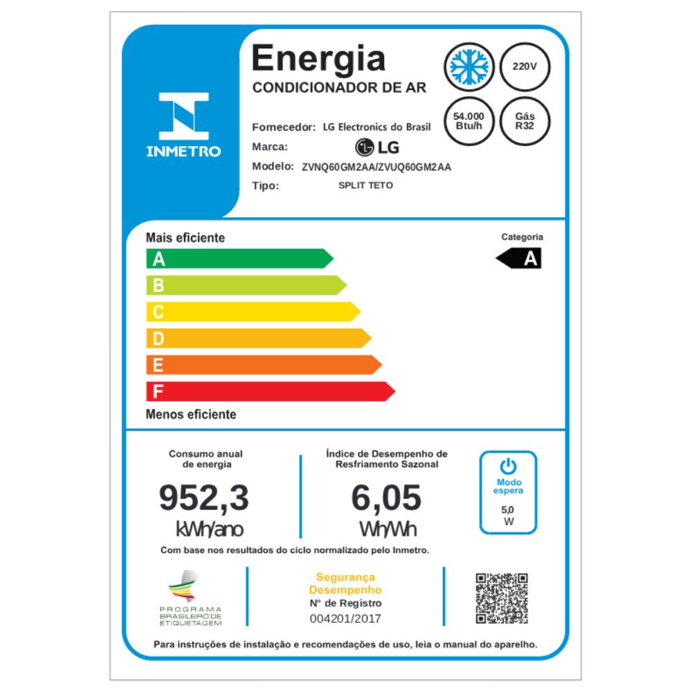 Ar Condicionado LG Teto 54000 BTUS 220V Frio - Climatize Grandes Espaços com Potência, Eficiência e Conforto ContínuoO Ar-Condicionado LG Teto Inverter combina potência, eficiência e praticidade em um design moderno e discreto. Com Wi-Fi integrado, é possível monitorar o consumo de energia e controlar o aparelho de qualquer lugar, com suporte para Google Assistant e Alexa, tornando a climatização mais simples e conveniente.Equipado com tecnologia Inverter, o modelo oferece até 70% de economia de energia e operação silenciosa, garantindo conforto e desempenho contínuo. O gás ecológico R-32 assegura alta eficiência com menor impacto ambiental, enquanto as aletas Black Fin e o revestimento epóxi protegem contra corrosão, umidade e poluição, aumentando a durabilidade do equipamento.Seu fluxo de ar alcança até 15 metros, distribuindo o ar de forma uniforme em grandes ambientes.O LG Teto Inverter oferece climatização poderosa, durabilidade e controle total na palma da mão.Especificações TécnicasMarca: LG Modelo: ZVUQ60GM2AA.ANWZBR1Modelo da Evaporadora: ZVNQ60GM2AAModelo da Condensadora: ZVUQ60GM2AATecnologia: Inverter Ciclo: FrioCapacidade: 54000 BTUs Voltagem: 220VGás Refrigerante: R-32Nível de Ruído: Evaporadora 50 dBModos de Operação: Refrigerar Conectividade Wi-Fi: InclusoSelo Anatel: Sim — Nº de homologação: 07749-17-04547Desnível Máximo entre Unidades: 30 mComprimento Máximo da Linha: 50 m Dimensões Evaporadora: 160 L x 23,5 A x 69 P cm Dimensões Condensadora: 95 L x 138 A x 33 P cm Peso Evaporadora: 36,9 Kg Peso Condensadora: 85 KgGarantia: 12 mesesOBS: Kit de instalação não incluso. A instalação deve ser realizada por técnico especializado.