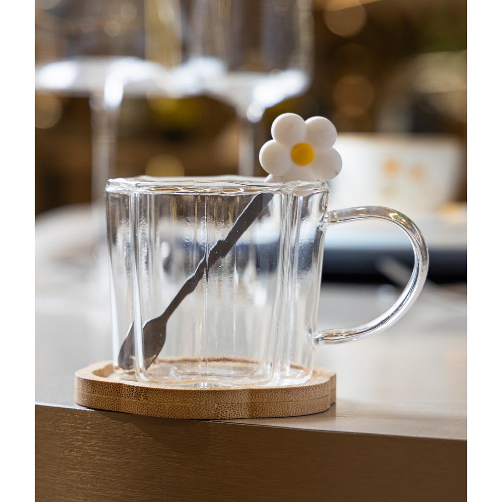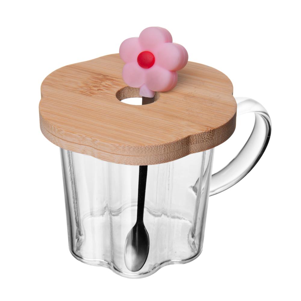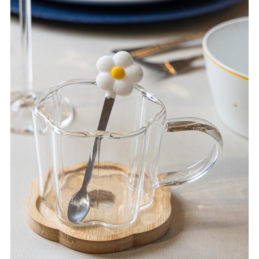 Xícara de chá Pires e Colher Flor Rosa 280ml Vidro