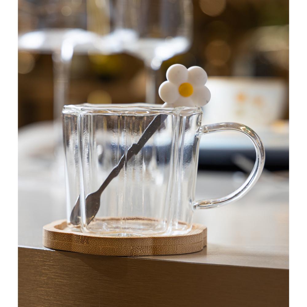 Xícara de chá Pires e Colher Flor Branca 280ml Vidro