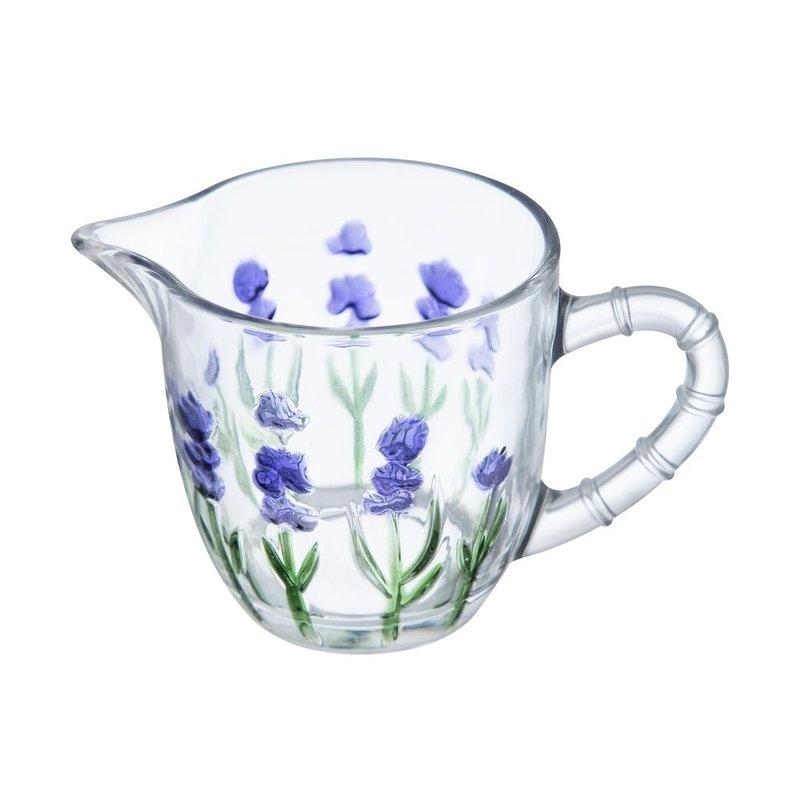 A Leiteira Fleur é produzida em vidro cristal transparente, conta com capacidade de 240 ml. Apresenta estampa florida com pintura manual em estêncil em alto relevo com flores de lavanda. A leiteira é delicada e traz uma estética romântica para a mesa-posta. Possui alça com detalhe em alto relevo, que transfere charme à peça, o bico direcionador facilita servir a bebida. Cuidados Lavar com detergente neutro, esponja macia e secar imediatamente, Não vai em lava-louças, não vai em micro-ondas. Camicado, casa com seu estilo!