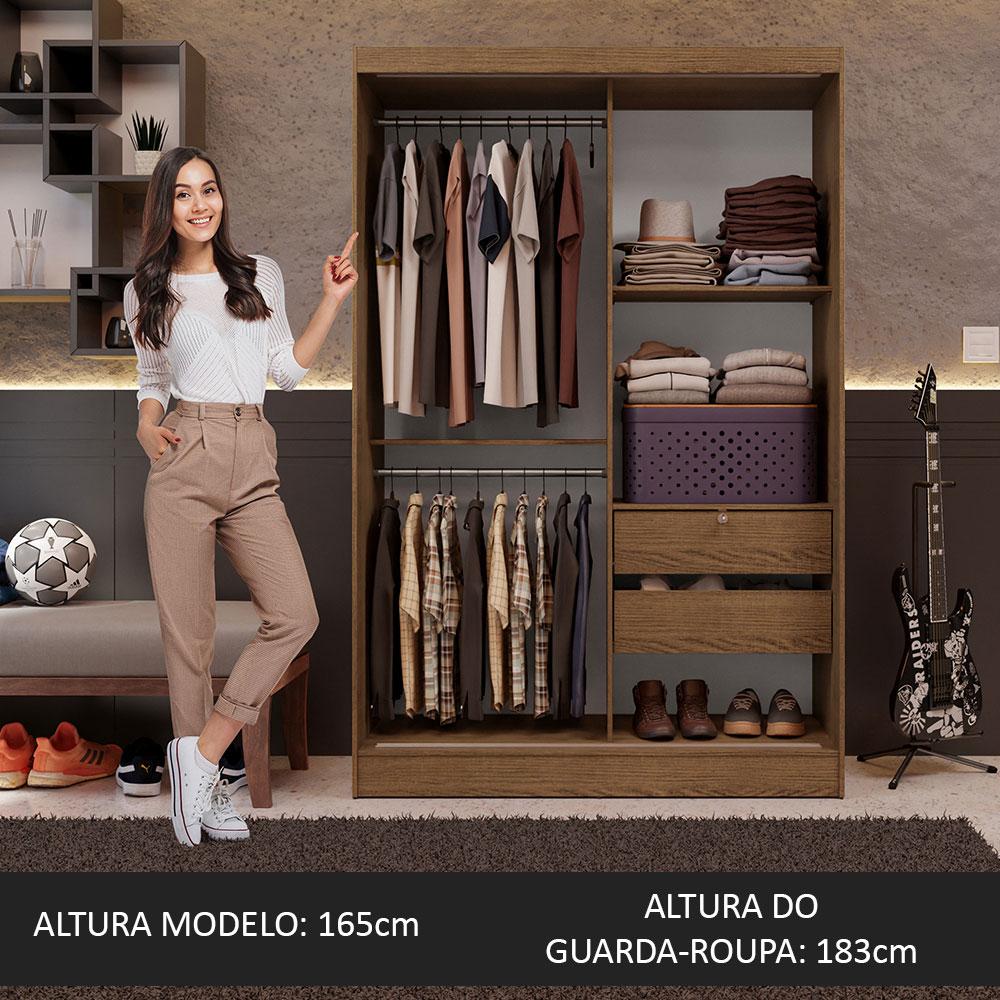 O Guarda-Roupa Luke é uma opção versátil e compacta para sua casa. Uma peça curinga que pode ser utilizada no dormitório de solteiro ou em diferentes cômodos da casa como um armário multiuso. Possui espaços internos bem distribuídos e duas gavetas de fácil manuseio, sendo que uma possui tranca com chave. As portas de correr de madeira permitem fácil acesso interno, além de não comprometer a circulação. O puxador em alumínio é muito resistente e com formato levemente inclinado facilitando a abertura.O acabamento interno e externo é em amadeirado Rustic. As partes internas das gavetas e das costas são brancas. O processo é feito em Pintura Poliéster de alta resistência que aumenta a durabilidade do móvel. Além disso, é ecológico, livre de vapores que prejudicam a atmosfera.As medidas finais do roupeiro são: 183 cm de altura x 120 cm de largura x 53 cm de profundidade.(As imagens são meramente ilustrativas.)Itens inclusos no armário:- Dois (2) cabideiros- Duas (2) gavetas- Uma (1) tranca com chave para gaveta- Três (3) prateleiras- Duas (2) portas de correr com puxadores em alumínioCódigo do produto: 10445ZAObs.: A Madesa não disponibiliza serviço de montagem. O produto segue com manual de instalação e todas as ferragens necessárias para sua montagem.1-O produto é novo ou usado?R.: Todos os produtos da Madesa são novos, enviados da nossa fábrica diretamente para as casas de nossos clientes.2-O produto vem montado? Se não, vocês realizam a montagem?R.: A Madesa não disponibiliza serviço de montagem. Todos os produtos seguem com manual de instalação e as ferragens necessárias. Alguns produtos possuem vídeo explicando o passo a passo da montagem.3-Vocês possuem loja física? Posso retirar meu produto em mãos?R.: Não possuímos loja física, apenas loja virtual. Confira as opções de envio ao colocar o seu CEP.4-Qual é o valor do envio? Posso pagar separadamente?R.: O valor do envio é calculado com base no peso e volume do produto, e no CEP de destino. Você pode calcular o valor e prazo de entrega no simulador.5-A Madesa entrega em todo Brasil? Como é feita a entrega?R.: Sim, entregamos no Brasil inteiro através de transportadoras parceiras.6-O produto acompanha Nota Fiscal?R.: Sim, todos os produtos são entregues com suas respectivas notas fiscais.7-Os produtos possuem garantia?R.: Sim. A Madesa oferece 3 meses de garantia para defeitos de fabricação.A Madesa se dedica à sustentabilidade com várias iniciativas: temos uma usina própria para gerar energia que abastece uma de nossas fábricas. Selecionamos nossos fornecedores, priorizando aqueles que possuem um compromisso com a sustentabilidade e proteção do meio ambiente. Todo o plástico utilizado no setor produtivo é proveniente de reciclagem e as suas sobras são encaminhadas ao fornecedor que os recicla. Também investimos no desenvolvimento contínuo de nossos colaboradores e em ações educacionais que beneficiem a comunidade.