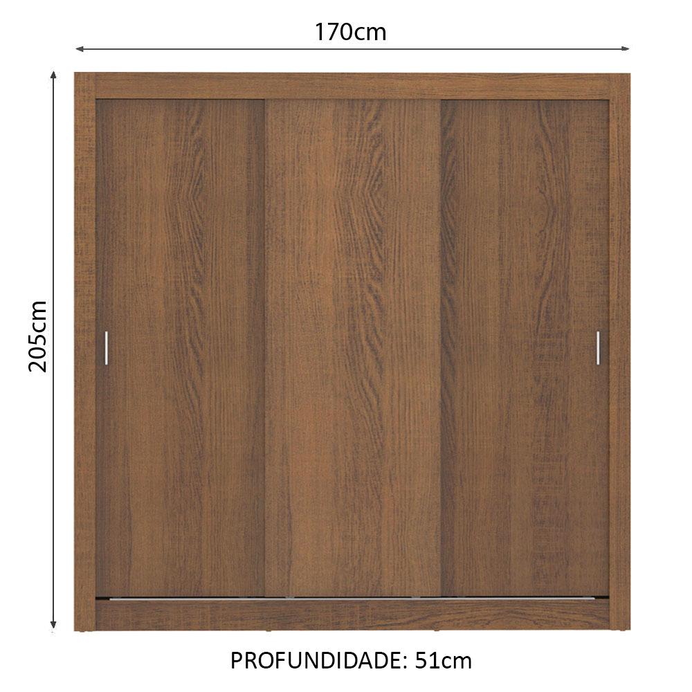 O Guarda-Roupa de Casal com melhor custo benefício do mercado. Ferragens de qualidade, cabideiro metálico e pintura em Poliéster Protetor que confere durabilidade e resistência. As portas de correr possuem trilho superior e inferior em alumínio e sistema de deslizamento suave garantindo melhor funcionamento.Total aproveitamento interno levando em conta o uso de duas pessoas. São duas gavetas internas na tonalidade branca com corrediça metálica, muitos nichos que facilitam a organização de roupas, calçados e acessórios. O tubo cabideiro é muito resistente e possui espaço para roupas longas.O acabamento externo é no padrão amadeirado Rustic e o interno é branco. Feito em Pintura Poliéster de alta resistência que confere maior durabilidade ao produto. A pintura é ecológica, isenta de gases que vão para a atmosfera.Medidas totais do armário: 205 cm de altura x 170 cm de largura x 51 cm de profundidade.Imagem meramente ilustrativa.Itens inclusos:- Três (3) prateleiras totalizando cinco (5) nichos- Duas (2) gavetas internas brancas- Um (1) cabideiro grande- Três (3) portas de correr e dois (2) puxadores em alumínioObs.: A Madesa não disponibiliza serviço de montagem. O produto segue com manual de instalação e todas as ferragens necessárias para sua montagem.1-O produto é novo ou usado?R.: Todos os produtos da Madesa são novos, enviados da nossa fábrica diretamente para as casas de nossos clientes.2-O produto vem montado? Se não, vocês realizam a montagem?R.: A Madesa não disponibiliza serviço de montagem. Todos os produtos seguem com manual de instalação e as ferragens necessárias. Alguns produtos possuem vídeo explicando o passo a passo da montagem.3-Vocês possuem loja física? Posso retirar meu produto em mãos?R.: Não possuímos loja física, apenas loja virtual. Confira as opções de envio ao colocar o seu CEP.4-Qual é o valor do envio? Posso pagar separadamente?R.: O valor do envio é calculado com base no peso e volume do produto, e no CEP de destino. Você pode calcular o valor e prazo de entrega no simulador.5-A Madesa entrega em todo Brasil? Como é feita a entrega?R.: Sim, entregamos no Brasil inteiro através de transportadoras parceiras.6-O produto acompanha Nota Fiscal?R.: Sim, todos os produtos são entregues com suas respectivas notas fiscais.7-Os produtos possuem garantia?R.: Sim. A Madesa oferece 3 meses de garantia para defeitos de fabricação.A Madesa se dedica à sustentabilidade com várias iniciativas: temos uma usina própria para gerar energia que abastece uma de nossas fábricas. Selecionamos nossos fornecedores, priorizando aqueles que possuem um compromisso com a sustentabilidade e proteção do meio ambiente. Todo o plástico utilizado no setor produtivo é proveniente de reciclagem e as suas sobras são encaminhadas ao fornecedor que os recicla. Também investimos no desenvolvimento contínuo de nossos colaboradores e em ações educacionais que beneficiem a comunidade.