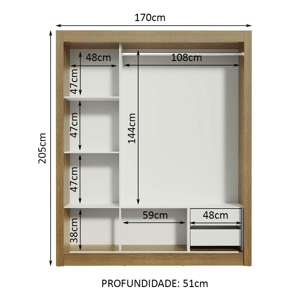 O Guarda-Roupa de Casal com melhor custo benefício do mercado. Ferragens de qualidade, cabideiro metálico e pintura em Poliéster Protetor que confere durabilidade e resistência. As portas de correr possuem trilho superior e inferior em alumínio e sistema de deslizamento suave garantindo melhor funcionamento.Total aproveitamento interno levando em conta o uso de duas pessoas. São duas gavetas internas com corrediça metálica, muitos nichos que facilitam a organização de roupas, calçados e acessórios. O tubo cabideiro é muito resistente e possui espaço para roupas longas.Possui acabamento da estrutura interna e externa em amadeirado Rustic. As portas, costas e gavetas possuem acabamento branco. A pintura é ecológica, isenta de gases que vão para a atmosfera.Medidas totais do armário: 205 cm de altura x 170 cm de largura x 51 cm de profundidade.Imagem meramente ilustrativa.Itens inclusos:- Três (3) prateleiras totalizando cinco (5) nichos- Duas (2) gavetas internas- Um (1) cabideiro grande- Três (3) portas de correr com 2 puxadores em alumínioObs.: A Madesa não disponibiliza serviço de montagem. O produto segue com manual de instalação e todas as ferragens necessárias para sua montagem.1-O produto é novo ou usado?R.: Todos os produtos da Madesa são novos, enviados da nossa fábrica diretamente para as casas de nossos clientes.2-O produto vem montado? Se não, vocês realizam a montagem?R.: A Madesa não disponibiliza serviço de montagem. Todos os produtos seguem com manual de instalação e as ferragens necessárias. Alguns produtos possuem vídeo explicando o passo a passo da montagem.3-Vocês possuem loja física? Posso retirar meu produto em mãos?R.: Não possuímos loja física, apenas loja virtual. Confira as opções de envio ao colocar o seu CEP.4-Qual é o valor do envio? Posso pagar separadamente?R.: O valor do envio é calculado com base no peso e volume do produto, e no CEP de destino. Você pode calcular o valor e prazo de entrega no simulador.5-A Madesa entrega em todo Brasil? Como é feita a entrega?R.: Sim, entregamos no Brasil inteiro através de transportadoras parceiras.6-O produto acompanha Nota Fiscal?R.: Sim, todos os produtos são entregues com suas respectivas notas fiscais.7-Os produtos possuem garantia?R.: Sim. A Madesa oferece 3 meses de garantia para defeitos de fabricação.A Madesa se dedica à sustentabilidade com várias iniciativas: temos uma usina própria para gerar energia que abastece uma de nossas fábricas. Selecionamos nossos fornecedores, priorizando aqueles que possuem um compromisso com a sustentabilidade e proteção do meio ambiente. Todo o plástico utilizado no setor produtivo é proveniente de reciclagem e as suas sobras são encaminhadas ao fornecedor que os recicla. Também investimos no desenvolvimento contínuo de nossos colaboradores e em ações educacionais que beneficiem a comunidade.