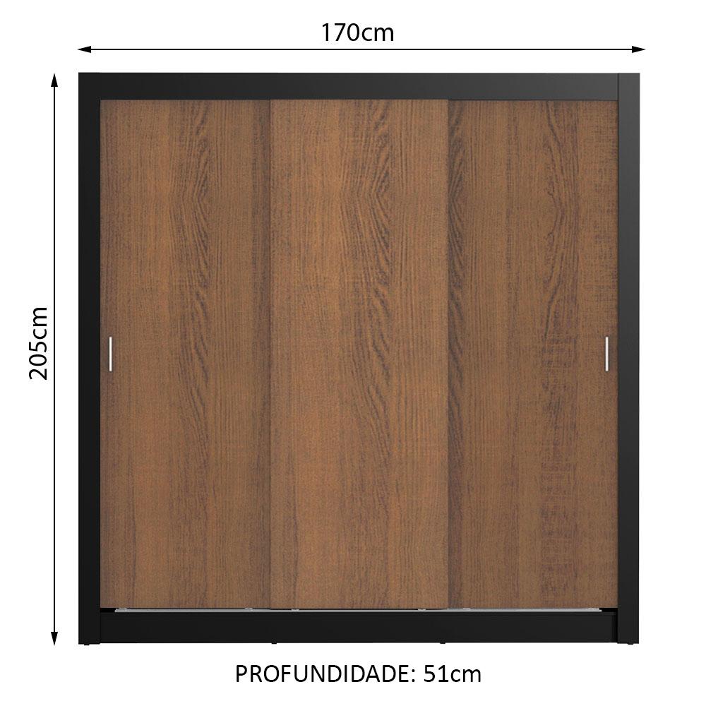 O Guarda-Roupa Lyon da Madesa conta com ferragens de qualidade, portas de correr com trilho superior e inferior em alumínio e sistema de deslizamento suave garantindo melhor funcionamento.O aproveitamento interno é ideal para um casal. São duas gavetas com corrediça metálica, além de vários nichos que facilitam a organização de roupas, calçados e acessórios. O tubo cabideiro é metálico, muito resistente e possui espaço para roupas longas.O acabamento da estrutura combina os tons branco e preto e as portas são no padrão amadeirado Rustic. O processo é feito com a Pintura Poliéster de 7 camadas exclusiva da Madesa, um método ecológico e que confere maior durabilidade ao produto.Medidas totais: 205 cm de altura x 170 cm de largura x 51 cm de profundidade.As imagens são meramente ilustrativas.Itens inclusos:- Três (3) prateleiras totalizando cinco (5) nichos- Um (1) cabideiro grande- Duas (2) gavetas internas- Três (3) portas de correr e dois (2) puxadores em alumínioCódigo do produto: 1093D82GObs.: A Madesa não disponibiliza serviço de montagem. O produto segue com as ferragens e manual com todos os passos para a instalação.1 – O produto é novo ou usado?R.: Todos os produtos da Madesa são novos, enviados da nossa fábrica diretamente para as casas de nossos clientes.2 – O produto vem montado? Se não, vocês realizam a montagem?R.: A Madesa não disponibiliza serviço de montagem. Todos os produtos seguem com manual de instalação e as ferragens necessárias. Alguns produtos possuem vídeo explicando o passo a passo da montagem.3 – Vocês possuem loja física? Posso retirar meu produto em mãos?R.: Não possuímos loja física, apenas loja virtual. Confira as opções de envio ao colocar o seu CEP.4 – Qual é o valor do envio? Posso pagar separadamente?R.: O valor do envio é calculado com base no peso e volume do produto, e no CEP de destino. Você pode calcular o valor e prazo de entrega no simulador.5 – A Madesa entrega em todo Brasil? Como é feita a entrega?R.: Sim, entregamos no Brasil inteiro através de transportadoras parceiras.6 – O produto acompanha Nota Fiscal?R.: Sim, todos os produtos são entregues com suas respectivas notas fiscais.7 – Os produtos possuem garantia?R.: Sim. A Madesa oferece 3 meses de garantia para defeitos de fabricação.A Madesa se dedica à sustentabilidade com várias iniciativas: temos uma usina própria para gerar energia que abastece uma de nossas fábricas. Selecionamos nossos fornecedores, priorizando aqueles que possuem um compromisso com a sustentabilidade e proteção do meio ambiente. Todo o plástico utilizado no setor produtivo é proveniente de reciclagem e as suas sobras são encaminhadas ao fornecedor que os recicla. Também investimos no desenvolvimento contínuo de nossos colaboradores e em ações educacionais que beneficiem a comunidade.