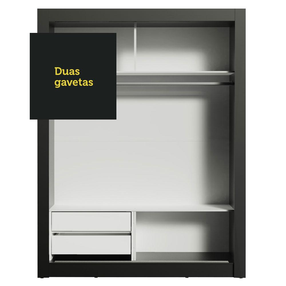 Guarda-Roupa com duas portas de correr de deslizamento suave, trilhos em alumínio, dobradiças metálicas e ferragens de qualidade que proporcionam melhor sustentação ao móvel. Contempla duas prateleiras e três nichos, além de um cabideiro de metal resistente e de tamanho diferenciado, 105 cm, com espaço para roupas longas.Um grande diferencial são os espelhos, presentes em ambas as portas. Este detalhe amplia o ambiente, além de ser muito prático no dia a dia. Além disso, as duas gavetas possuem corrediças metálicas e aumentam o espaço útil do guarda-roupa, pois permitem uma melhor organização de roupas e acessórios.Pensado na medida certa para quarto de solteiro, possui acabamento interno branco. A parte externa e as portas são pretas. O processo é feito coma Pintura Poliéster de 7 camadas exclusiva da Madesa. Este processo é ecológico e aumenta a durabilidade ao móvel.Medidas totais do guarda-roupa: 205 cm de altura x 117 cm de largura x 51 cm de profundidade.As imagens são meramente ilustrativas.Itens inclusos:- Um (1) cabideiro metálico grande- Duas (2) prateleiras e três (3) nichos- Duas (2) gavetas com corrediças metálicas- Duas (2) portas de correr com espelhos e puxadores em PVCCódigo do produto: 10948N2E2GObs.: A Madesa não oferece serviço de montagem. A embalagem acompanha ferragens e manual com todos os passos para a montagem do produto.1 – O produto é novo ou usado?R.: Todos os produtos da Madesa são novos, enviados da nossa fábrica diretamente para as casas de nossos clientes.2 – O produto vem montado? Se não, vocês realizam a montagem?R.: A Madesa não disponibiliza serviço de montagem. Todos os produtos seguem com manual de instalação e as ferragens necessárias. Alguns produtos possuem vídeo explicando o passo a passo da montagem.3 – Vocês possuem loja física? Posso retirar meu produto em mãos?R.: Não possuímos loja física, apenas loja virtual. Confira as opções de envio ao colocar o seu CEP.4 – Qual é o valor do envio? Posso pagar separadamente?R.: O valor do envio é calculado com base no peso e volume do produto, e no CEP de destino. Você pode calcular o valor e prazo de entrega no simulador.5 – A Madesa entrega em todo Brasil? Como é feita a entrega?R.: Sim, entregamos no Brasil inteiro através de transportadoras parceiras.6 – O produto acompanha Nota Fiscal?R.: Sim, todos os produtos são entregues com suas respectivas notas fiscais.7 – Os produtos possuem garantia?R.: Sim. A Madesa oferece 3 meses de garantia para defeitos de fabricação.A Madesa se dedica à sustentabilidade com várias iniciativas: temos uma usina própria para gerar energia que abastece uma de nossas fábricas. Selecionamos nossos fornecedores, priorizando aqueles que possuem um compromisso com a sustentabilidade e proteção do meio ambiente. Todo o plástico utilizado no setor produtivo é proveniente de reciclagem e as suas sobras são encaminhadas ao fornecedor que os recicla. Também investimos no desenvolvimento contínuo de nossos colaboradores e em ações educacionais que beneficiem a comunidade.