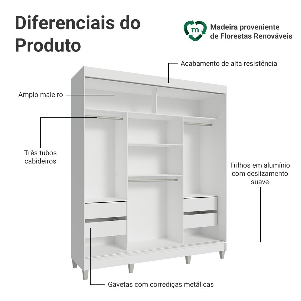 Se você precisa de mais espaço para organizar todas as suas roupas e acessórios sem abrir mão da praticidade, o Guarda-Roupa Reno da Madesa é a escolha ideal. Ele foi desenvolvido para otimizar ambientes, oferecendo muito armazenamento em um móvel moderno e funcional.Você recebe um guarda-roupa com três portas de correr em trilhos de alumínio que garantem abertura suave, sendo a porta central com espelho para ampliar o ambiente. São quatro gavetas espaçosas, três cabideiros e além disso, sobra espaço para malas, travesseiros, colchas e calçados.O grande diferencial desta versão está nos pés, que elevam o móvel e facilitam a limpeza do quarto. O acabamento combina estrutura em branco com portas em cinza, em um visual elegante. Um guarda-roupa versátil, perfeito para transformar o seu quarto em um ambiente mais bonito, organizado e prático.Medidas do produto montado:- 180 cm de largura- 54 cm de profundidade- 215 cm de alturaO que você recebe:- Um Guarda-Roupa com três portas de correr, sendo uma delas com espelhoCódigo do produto: 1095F81ECPÉ importante saber:- Material: MDP- Imagens meramente ilustrativas, a decoração não acompanha o produto- A Madesa não disponibiliza serviço de montagem- O produto segue com manual de instalação e todas as ferragens necessárias para sua montagemA Madesa se dedica à sustentabilidade com várias iniciativas: temos uma usina própria que gera energia para uma das fábricas. Priorizamos fornecedores responsáveis com o meio ambiente. Todo o plástico utilizado na produção é reciclado, e as sobras também são reaproveitadas. Investimos no desenvolvimento de nossos colaboradores e em ações que beneficiem a comunidade.