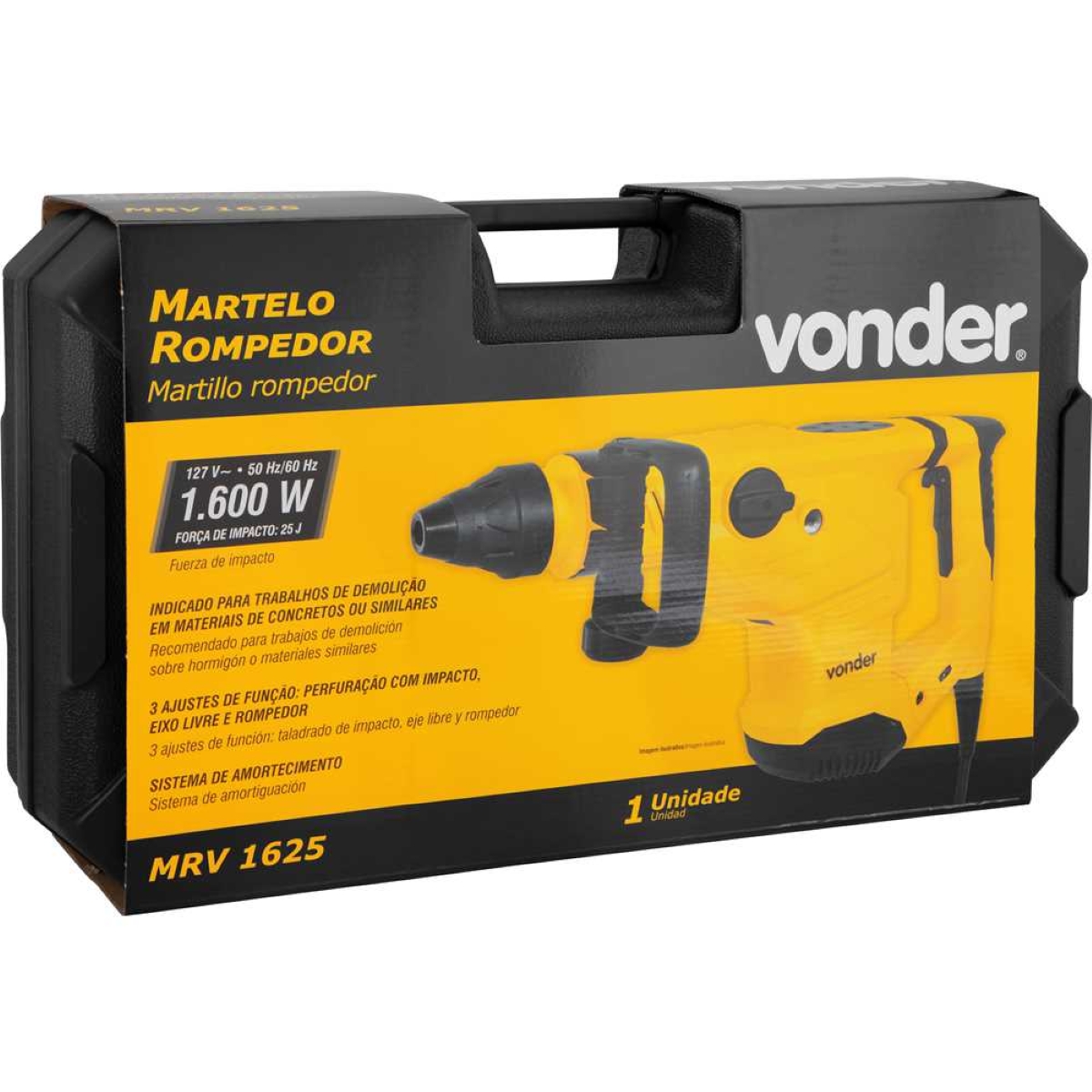 Martelo Rompedor/Perfurador SDS-Max 1600W Vonder: Demolição e Perfuração com Potência e Conforto Liberte o poder da demolição e perfuração com o Martelo Rompedor/Perfurador SDS-Max MRV1625 da Vonder. Projetado para profissionais e entusiastas da construção civil, este equipamento robusto de 1600W oferece a combinação ideal de potência, versatilidade e conforto. Com energia de impacto de 25 Joules e 6 velocidades ajustáveis, você terá o controle necessário para enfrentar os desafios mais exigentes, desde a demolição de concreto até a perfuração precisa em diversos materiais. O sistema de encaixe SDS MAX garante trocas rápidas e seguras de acessórios, otimizando seu tempo de trabalho. A ergonomia é um ponto forte, com punho auxiliar ajustável, interruptor com trava e punho lateral, minimizando a fadiga e maximizando o controle. Invista em um equipamento que eleva a qualidade e a eficiência dos seus projetos. Especificações Modelo: MRV 1625 Potência: 1600 W Tipo de encaixe: SDS MAX Energia de impacto: 25 J Rotações por minuto - rpm: 550/min - 2.100/min Impactos por minuto (ipm): 550/min - 2.100/min Capacidade máxima de perfuração em concreto: 48 mm Tensão (V~): 127 V~ Frequência (Hz): 50 Hz / 60 Hz Aceleração transmitida nas mãos - braços do operador - ah: 18,04 m/s² Massa aproximada (peso): 11,6 kg Itens Inclusos 1 Martelo rompedor/perfurador 1 Punho auxiliar 1 Punho auxiliar lateral 1 Chave dois pinos 1 Maleta plástica Perguntas Frequentes (FAQ) Pergunta: Qual a voltagem do martelo rompedor?Resposta: 127 V~ Pergunta: O martelo rompedor possui sistema de reversão?Resposta: Não, este modelo não possui sistema de reversão. Pergunta: Quais as funções do martelo rompedor?Resposta: Possui 3 ajustes de função: Rompedor, Eixo livre e Perfurador com impacto. Pergunta: Qual o período de garantia do produto?Resposta: Garantia legal: 1 ano Pergunta: Este martelo rompedor é adequado para quais tipos de materiais?Resposta: É indicado para trabalhos de demolição em materiais de concretos ou similares, instalação de tubos, cabos e outras obras de engenharia civil.