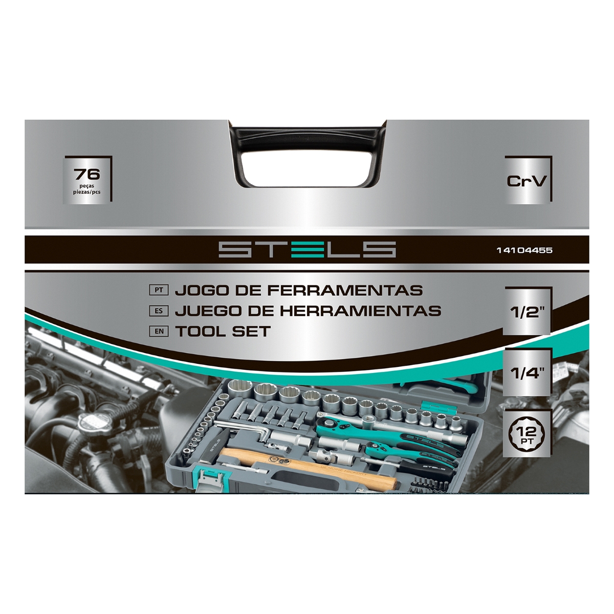 Jogo de Ferramentas Encaixe 1/2'' e 1/4'' 76 Peças Aço Cromo Vanádio Maleta Plástica Stels 14104455
