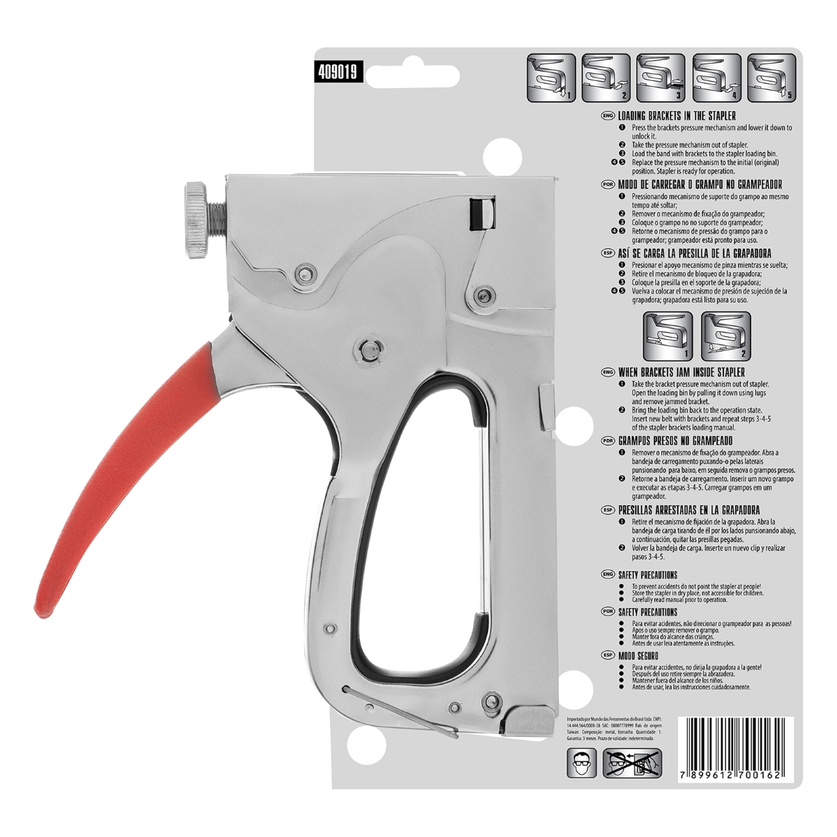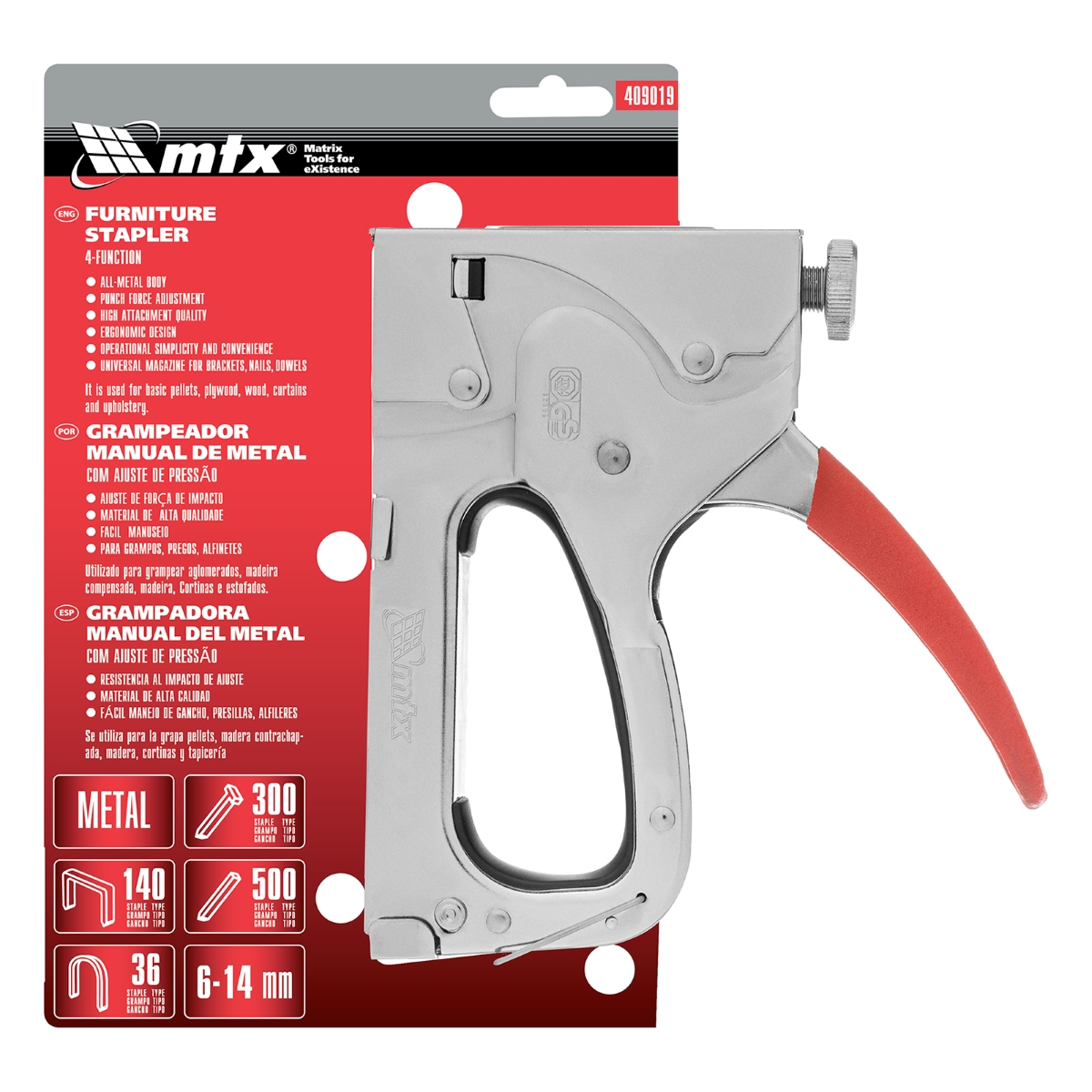 Grampeador Manual Ajustável MTX: Fixação Precisa para Diversos Materiais O Grampeador Manual MTX 409019 é a ferramenta ideal para quem busca eficiência e versatilidade em fixações. Projetado para uso intensivo, este grampeador aceita grampos dos tipos 140, 36, 300 e 500, com tamanho de 6 a 14mm, tornando-o perfeito para uma ampla gama de aplicações. Desde a montagem e estofamento de móveis até a instalação de carpetes, cabos de baixa tensão, molduras e a fixação de materiais como compensado, papelão, MDF, HDF, filme e isolamento em madeira, este grampeador oferece soluções eficazes para seus projetos. Sua construção robusta em aço estampado garante durabilidade e resistência, enquanto o ajuste fino da força de impacto permite um controle preciso sobre a profundidade de penetração dos grampos, adaptando-se a diferentes tipos de materiais, inclusive madeiras mais duras. A reserva de energia integrada aumenta a eficiência, reduzindo o esforço necessário para cada fixação. Além disso, o acabamento cromado do corpo protege contra a corrosão, prolongando a vida útil da ferramenta. A segurança é priorizada com um grampo de fixação que impede acionamentos acidentais durante o armazenamento e transporte. Especificações Material da empunhadura: Aço Material do corpo: Metal Tipos de grampos: 140, 300, 36, 500 Tamanho máximo dos grampos: 14 mm País de fabricação: Taiwan Itens Inclusos Grampeador Manual MTX 409019 Perguntas Frequentes (FAQ) Pergunta: Quais tipos de grampos este grampeador aceita?Resposta: Este grampeador é compatível com grampos dos tipos 140, 36, 300 e 500. Pergunta: Qual o tamanho máximo de grampo que posso usar?Resposta: O tamanho máximo de grampo aceito é de 14 mm. Pergunta: Este grampeador possui ajuste de força?Resposta: Sim, o grampeador possui ajuste fino da força de impacto para maior controle e versatilidade. Pergunta: Qual a garantia do produto?Resposta: Garantia legal: 90 dias
