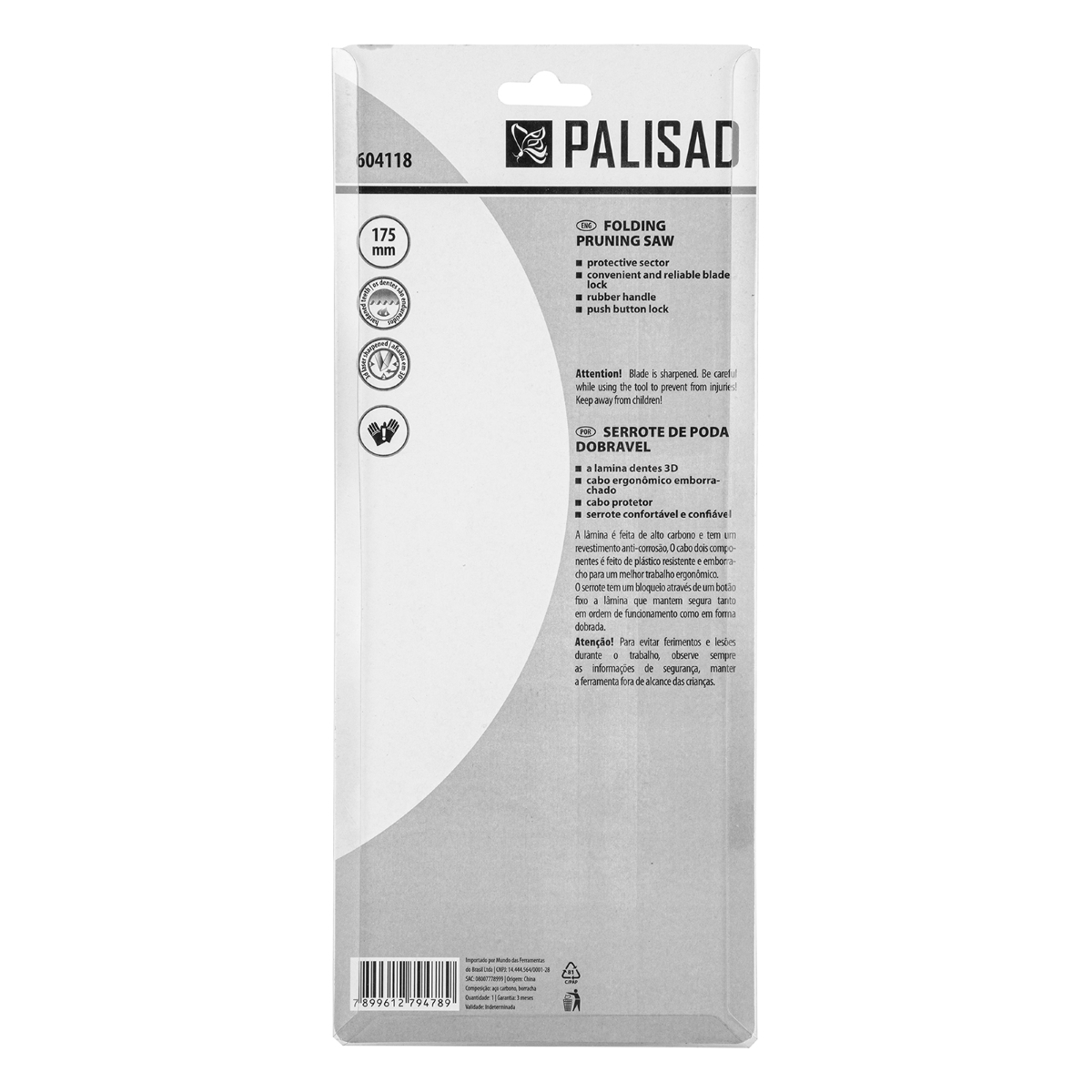 Serrote de Poda Dobrável Palisad: Corte Preciso e Seguro para Seu Jardim O Serrote de Poda Dobrável Palisad 604118 é a ferramenta ideal para quem busca eficiência, portabilidade e segurança na hora de cuidar do jardim ou realizar trabalhos de paisagismo. Projetado para cortar madeira seca ou úmida com facilidade, este serrote se destaca pela sua durabilidade e versatilidade. Sua lâmina de 175 mm, fabricada em aço de mola elástico, garante resistência e flexibilidade, suportando o uso contínuo sem perder a eficácia. Os dentes temperados e afiados proporcionam cortes precisos e limpos, enquanto o design com espaçamento adequado evita que a lâmina trave na madeira, facilitando o trabalho. A segurança é prioridade, com uma capa protetora no cabo que minimiza o risco de lesões em áreas com vegetação densa. O cabo ergonômico, com revestimento emborrachado, oferece uma pegada firme e confortável, reduzindo a fadiga durante o uso prolongado. Ideal para entusiastas do jardim, profissionais e aventureiros, o Serrote de Poda Dobrável Palisad é a solução completa para todas as suas necessidades de poda. Especificações Material da Empunhadura: Polipropileno Revestimento da Lâmina: Verniz TPI (Dentes por Polegada): 4 TPI Tipo de Dentes: 3D Comprimento Total (Desdobrado): 385 mm Comprimento Total (Dobrado): 385 mm País de Fabricação: China Itens Inclusos Serrote de Poda Dobrável Palisad 604118 Perguntas Frequentes (FAQ) Pergunta: Qual o material da lâmina?Resposta: A lâmina é fabricada em aço de mola elástico, garantindo durabilidade e flexibilidade. Pergunta: O serrote é adequado para quais tipos de madeira?Resposta: Este serrote é projetado para cortar madeira seca ou úmida, tanto longitudinal quanto transversalmente. Pergunta: Qual a garantia do produto?Resposta: Garantia legal: 90 dias