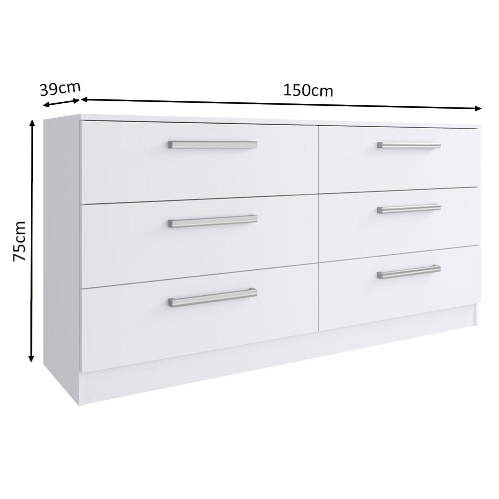 A Cômoda Laura da Madesa é uma opção moderna, bonita e espaçosa para o seu dormitório. As corrediças são metálicas e as ferragens de qualidade garantem uma ótima sustentação ao móvel.Com um vasto espaço interno, as seis gavetas proporcionam uma melhor organização de roupas, acessórios e o que mais você preferir.O acabamento é branco, em Pintura Poliéster de alta resistência que aumenta a qualidade e durabilidade do produto. Além disso, é ecológica, livre de vapores que prejudicam a atmosfera.Medidas da cômoda: 75 cm de altura x 150 cm de largura x 39 cm de profundidade.Imagem meramente ilustrativa.Itens inclusos:- Uma (1) cômoda branca com 6 gavetas com puxadores em PVCCódigo do produto: 3435092Obs.: A Madesa não disponibiliza serviço de montagem. O produto segue com manual de instalação e todas as ferragens necessárias para sua montagem.1-O produto é novo ou usado?R.: Todos os produtos da Madesa são novos, enviados da nossa fábrica diretamente para as casas de nossos clientes.2-O produto vem montado? Se não, vocês realizam a montagem?R.: A Madesa não disponibiliza serviço de montagem. Todos os produtos seguem com manual de instalação e as ferragens necessárias. Alguns produtos possuem vídeo explicando o passo a passo da montagem.3-Vocês possuem loja física? Posso retirar meu produto em mãos?R.: Não possuímos loja física, apenas loja virtual. Confira as opções de envio ao colocar o seu CEP.4-Qual é o valor do envio? Posso pagar separadamente?R.: O valor do envio é calculado com base no peso e volume do produto, e no CEP de destino. Você pode calcular o valor e prazo de entrega no simulador.5-A Madesa entrega em todo Brasil? Como é feita a entrega?R.: Sim, entregamos no Brasil inteiro através de transportadoras parceiras.6-O produto acompanha Nota Fiscal?R.: Sim, todos os produtos são entregues com suas respectivas notas fiscais.7-Os produtos possuem garantia?R.: Sim. A Madesa oferece 3 meses de garantia para defeitos de fabricação.A Madesa se dedica à sustentabilidade com várias iniciativas: temos uma usina própria para gerar energia que abastece uma de nossas fábricas. Selecionamos nossos fornecedores, priorizando aqueles que possuem um compromisso com a sustentabilidade e proteção do meio ambiente. Todo o plástico utilizado no setor produtivo é proveniente de reciclagem e as suas sobras são encaminhadas ao fornecedor que os recicla. Também investimos no desenvolvimento contínuo de nossos colaboradores e em ações educacionais que beneficiem a comunidade.