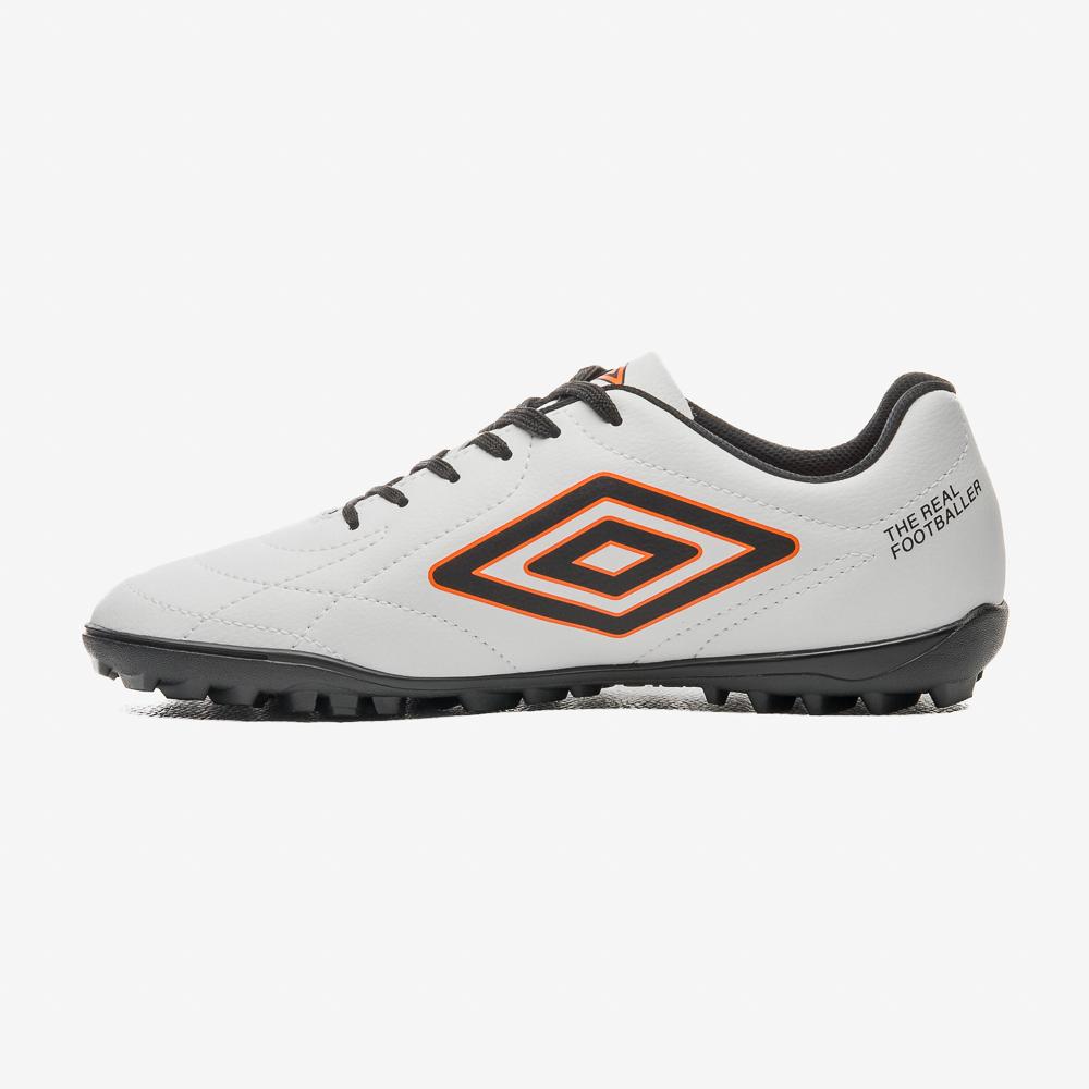 A Chuteira Society Umbro Class Footballer é um modelo consagrado, agora com um visual renovado e aprimorado. Indicada para jogadores de nível intermediário que procuram qualidade e conforto para se destacar nas partidas, esta chuteira combina um design clássico com performance superior. O cabedal é confeccionado em material laminado com textura de couro relax, apresentando aplique de artes gráficas em serigrafia e o logo Diamante centralizado na lateral, com costuras programadas. Possui palmilha interna em EVA e solado de futebol society HG em material PVC, com travas em barra e chevron.