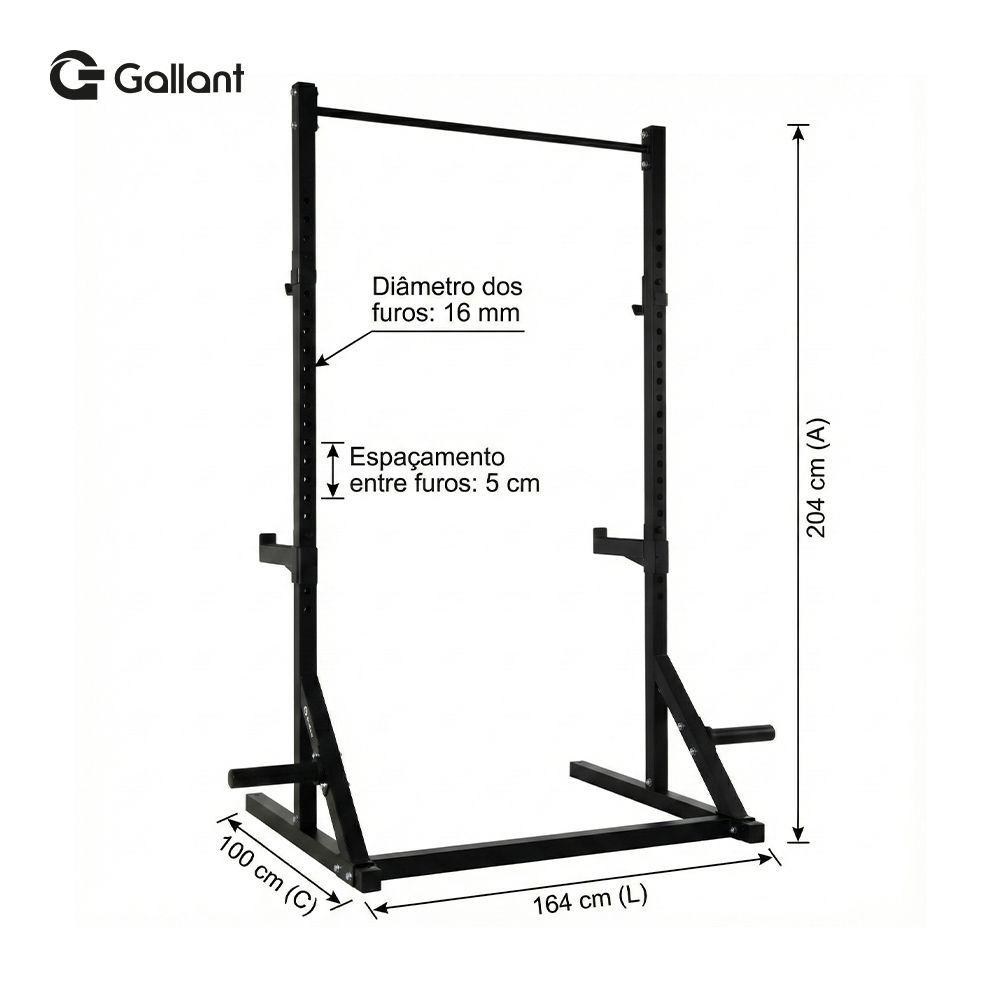 Rack de Agachamento Gallant GRA01FE01A-PT O Rack de Agachamento Gallant é um equipamento semi profissional, ideal para residências, academias de condomínio e estúdios. Suporta até 250 kg nos suportes inferiores, 150 kg nos ganchos frontais e 200 kg na barra de pull-up. Compatível com barras olímpicas e não olímpicas. Características Estrutura reforçada em aço tubular 60×60mm Furos com 16mm de diâmetro Kit com colunas, travessas, j-hooks e suporte para pull-up Dúvidas Frequentes Acompanha barra olímpica? Não. Serve para barra de 120 cm? Não recomendado, ideal a partir de 1,80 m. Precisa fixar no chão? Sim, kit incluso. Especificações Técnicas Marca: Gallant Modelo: GRA01FE01A-PT Classificação de Uso: Semi profissional (residencial, estúdios, academias de condomínio) Estrutura Tubular: Aço 60×60mm Acabamento: Pintura eletrostática preta fosca Dobrável: Não Fixação: Sim, acompanha kit Estabilizadores com borracha: Não Peso líquido: 30,3kg Peso bruto: 32,8kg Dimensões do Produto (C×L ×A): 100×26×205cm Dimensões da Embalagem (C ×L×A): 204×30,5×12,5cm Carga máxima - Barra superior (pull-up): 200kg Carga máxima - Ganchos frontais: 150kg Carga máxima - Suportes inferiores: 250 kg (125kg cada lado) Compatibilidade: Barras de 2m, 2,20m (20 kg), 2m (15 kg) Diâmetro dos furos: 16mm Espaçamento: 5cm Tipo de acoplamento: Engate rápido Kit incluso: 2 colunas, 2 j-hooks, 1 suporte pull-up, 1 travessa superior, 2 travessas base, kit parafusos Exercícios: Agachamento, supino, desenvolvimento, barra fixa, levantamento Músculos: Quadríceps, isquiotibiais, costas, bíceps Garantia: 6 meses