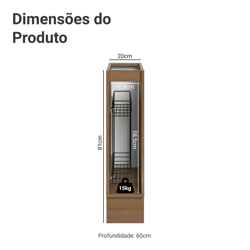 O Armário Porta-Temperos foi pensado para deixar seus temperos sempre ao alcance, agora na versão com porta para deixar ainda mais organizado.Equipado com um organizador metálico exclusivo, que desliza suavemente através de corrediças de abertura total, garantindo acesso fácil. A porta possui dobradiças com amortecimento, garantindo um fechamento suave e silencioso. Os pés são reguláveis e o rodapé é removível, facilitando a limpeza da parte inferior.A estrutura em tom amadeirado Rustic combinada com a porta cinza e vidro sobreposto, resulta em uma estética elegante e moderna.Importante: este balcão é vendido sem tampo, ideal para quem deseja personalizar o acabamento.Medidas totais:- 81 cm de altura- 20 cm de largura- 60 cm de profundidadeInformações técnicas:- Material: MDP- Peso suportado: 15kg- Altura dos pés: reguláveis de 15cm a 20cmO que você recebe:- Um Armário Porta-Temperos com uma porta (Não acompanha tampo)Código do produto: G222029NLXÉ importante saber:- Imagens meramente ilustrativas, a decoração não acompanha o produto- A Madesa não disponibiliza serviço de montagem- O produto segue com manual de instalação e todas as ferragens necessárias para sua montagemA Madesa possui compromisso com a sustentabilidade. Geramos energia limpa em nossa própria usina, priorizamos fornecedores responsáveis e utilizamos plástico reciclado em nossa produção. Além disso, reinserimos sobras no ciclo de reciclagem e investimos no desenvolvimento de nossos colaboradores e da comunidade.Garantia: Este produto conta com 1 ano de garantia total, sendo 3 meses de garantia legal e 9 meses de garantia contratual. A garantia cobre exclusivamente defeitos de fabricação e vícios ocultos. Não estão cobertos: problemas decorrentes de montagem incorreta, uso inadequado, exposição à umidade, calor ou luz solar direta, modificações no produto ou desgaste natural.
