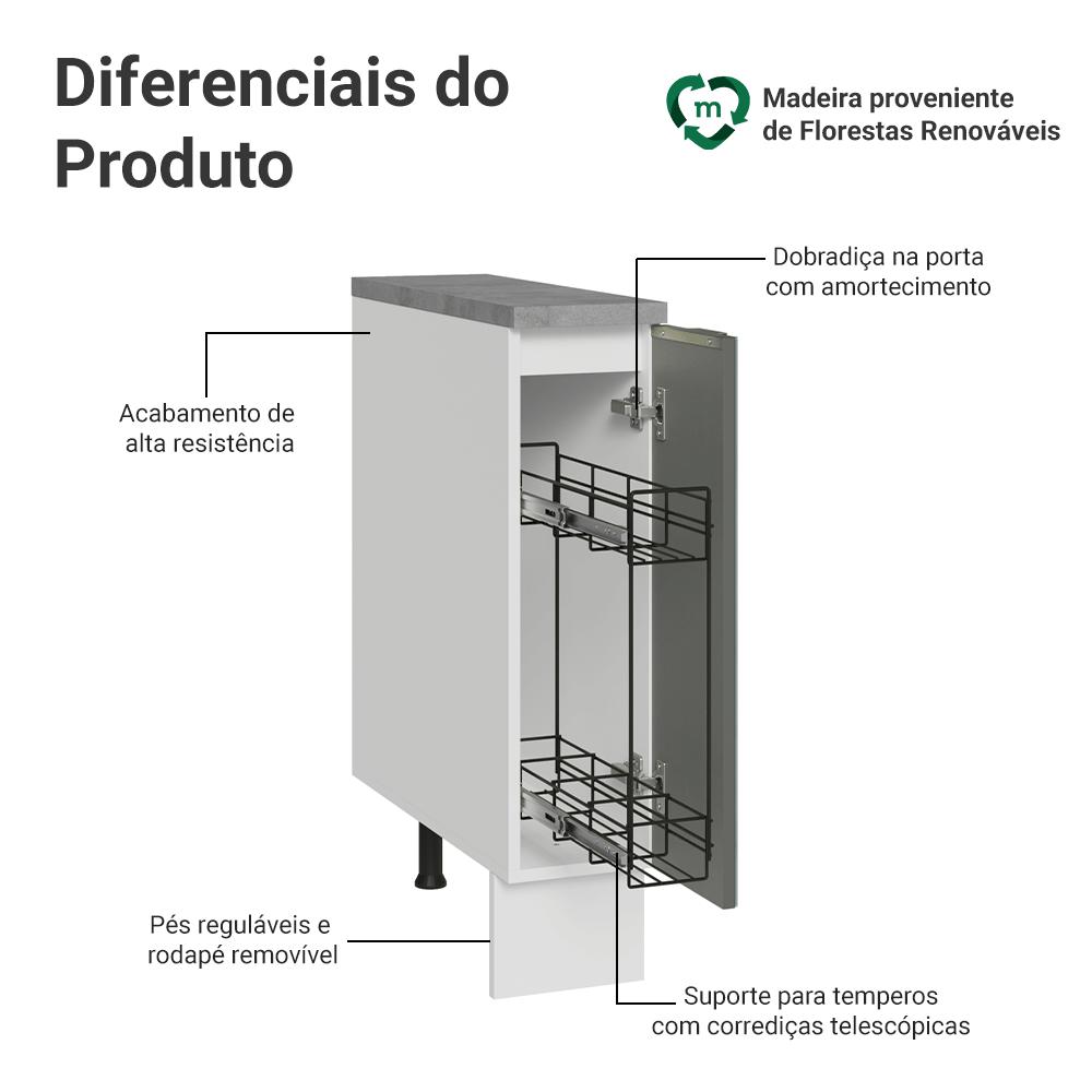 O Armário Porta-Temperos foi pensado para deixar seus temperos sempre ao alcance, agora na versão com porta para deixar ainda mais organizado.Equipado com um organizador metálico exclusivo, que desliza suavemente através de corrediças de abertura total, garantindo acesso fácil. A porta possui dobradiças com amortecimento, garantindo um fechamento suave e silencioso. Os pés são reguláveis e o rodapé é removível, facilitando a limpeza da parte inferior.A estrutura branca combinada com a porta cinza cria um visual marcante e atemporal. O vidro sobreposto na porta acrescenta um toque moderno e elegante, além de garantir um acabamento mais resistente.Medidas totais:- 84 cm de altura- 20 cm de largura- 60 cm de profundidadeInformações técnicas:- Material: MDP- Peso suportado: 45kg- Altura dos pés: reguláveis de 15cm a 20cmO que você recebe:- Um Armário Porta-Temperos com uma porta (Acompanha tampo)Código do produto: G222029RLXCTÉ importante saber:- Imagens meramente ilustrativas, a decoração não acompanha o produto- A Madesa não disponibiliza serviço de montagem- O produto segue com manual de instalação e todas as ferragens necessárias para sua montagemA Madesa possui compromisso com a sustentabilidade. Geramos energia limpa em nossa própria usina, priorizamos fornecedores responsáveis e utilizamos plástico reciclado em nossa produção. Além disso, reinserimos sobras no ciclo de reciclagem e investimos no desenvolvimento de nossos colaboradores e da comunidade.Garantia: Este produto conta com 1 ano de garantia total, sendo 3 meses de garantia legal e 9 meses de garantia contratual. A garantia cobre exclusivamente defeitos de fabricação e vícios ocultos. Não estão cobertos: problemas decorrentes de montagem incorreta, uso inadequado, exposição à umidade, calor ou luz solar direta, modificações no produto ou desgaste natural.