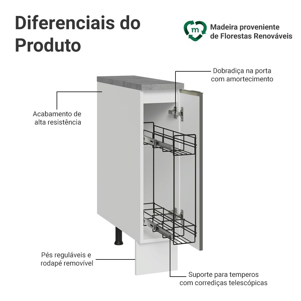 O Armário Porta-Temperos foi pensado para deixar seus temperos sempre ao alcance, agora na versão com porta para deixar ainda mais organizado.Equipado com um organizador metálico exclusivo, que desliza suavemente através de corrediças de abertura total, garantindo acesso fácil. A porta possui dobradiças com amortecimento, garantindo um fechamento suave e silencioso. Os pés são reguláveis e o rodapé é removível, facilitando a limpeza da parte inferior.O acabamento branco veludo traz um visual elegante ao móvel, deixando a cozinha mais sofisticada.Medidas totais:- 84 cm de altura- 20 cm de largura- 60 cm de profundidadeInformações técnicas:- Material: MDP- Peso suportado: 45kg- Altura dos pés: reguláveis de 15cm a 20cmO que você recebe:- Um Armário Porta-Temperos com uma porta (Acompanha tampo)Código do produto: G22202H7LXCTÉ importante saber:- Imagens meramente ilustrativas, a decoração não acompanha o produto- A Madesa não disponibiliza serviço de montagem- O produto segue com manual de instalação e todas as ferragens necessárias para sua montagemA Madesa possui compromisso com a sustentabilidade. Geramos energia limpa em nossa própria usina, priorizamos fornecedores responsáveis e utilizamos plástico reciclado em nossa produção. Além disso, reinserimos sobras no ciclo de reciclagem e investimos no desenvolvimento de nossos colaboradores e da comunidade.Garantia: Este produto conta com 1 ano de garantia total, sendo 3 meses de garantia legal e 9 meses de garantia contratual. A garantia cobre exclusivamente defeitos de fabricação e vícios ocultos. Não estão cobertos: problemas decorrentes de montagem incorreta, uso inadequado, exposição à umidade, calor ou luz solar direta, modificações no produto ou desgaste natural.