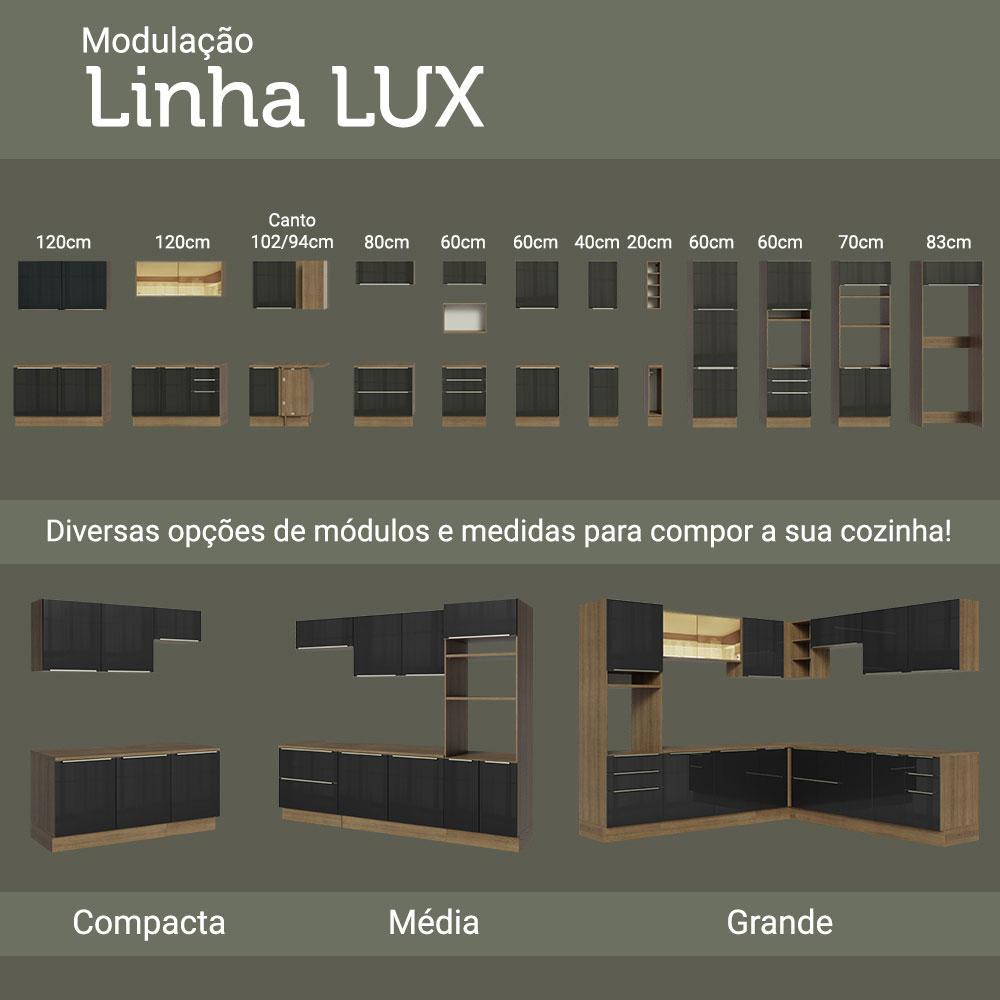 O Balcão de 80 cm da linha Lux da Madesa possui duas portas e ótimo espaço interno, ideal para organizar panelas, louças, mantimentos, eletroportáteis e muito mais. Possui puxadores em alumínio e corrediças telescópicas, diferenciais que proporcionam maior durabilidade ao produto.O vidro preto aplicado nas portas é o grande destaque, trazendo sofisticação e mais beleza para sua cozinha.O acabamento da estrutura interna e externa é no padrão amadeirado Rustic. A parte interna das costas é branca e as portas são pretas. O método utilizado é a Pintura Poliéster ecológica com 7 camadas que protegem o móvel dos efeitos da água e do calor.Este balcão pode ser combinado com outros módulos e com todas as cozinhas da linha Lux da Madesa.As imagens são meramente ilustrativas.Itens inclusos:- Um (1) Balcão de 81 cm de altura x 80 cm de largura x 60 cm de profundidade com duas (2) portas (Não acompanha tampo)Código do produto: G228007KLXObs.: A Madesa não disponibiliza serviço de montagem. O produto segue com manual de instalação e todas as ferragens necessárias para sua montagem.1 – O produto é novo ou usado?R.: Todos os produtos da Madesa são novos, enviados da nossa fábrica diretamente para as casas de nossos clientes.2 – O produto vem montado? Se não, vocês realizam a montagem?R.: A Madesa não disponibiliza serviço de montagem. Todos os produtos seguem com manual de instalação e as ferragens necessárias. Alguns produtos possuem vídeo explicando o passo a passo da montagem.3 – Vocês possuem loja física? Posso retirar meu produto em mãos?R.: Não possuímos loja física, apenas loja virtual. Confira as opções de envio ao colocar o seu CEP.4 – Qual é o valor do envio? Posso pagar separadamente?R.: O valor do envio é calculado com base no peso e volume do produto, e no CEP de destino. Você pode calcular o valor e prazo de entrega no simulador.5 – A Madesa entrega em todo Brasil? Como é feita a entrega?R.: Sim, entregamos no Brasil inteiro através de transportadoras parceiras.6 – O produto acompanha Nota Fiscal?R.: Sim, todos os produtos são entregues com suas respectivas notas fiscais.7 – Os produtos possuem garantia?R.: Sim. A Madesa oferece 3 meses de garantia para defeitos de fabricação.A Madesa se dedica à sustentabilidade com várias iniciativas: temos uma usina própria para gerar energia que abastece uma de nossas fábricas. Selecionamos nossos fornecedores, priorizando aqueles que possuem um compromisso com a sustentabilidade e proteção do meio ambiente. Todo o plástico utilizado no setor produtivo é proveniente de reciclagem e as suas sobras são encaminhadas ao fornecedor que os recicla. Também investimos no desenvolvimento contínuo de nossos colaboradores e em ações educacionais que beneficiem a comunidade.