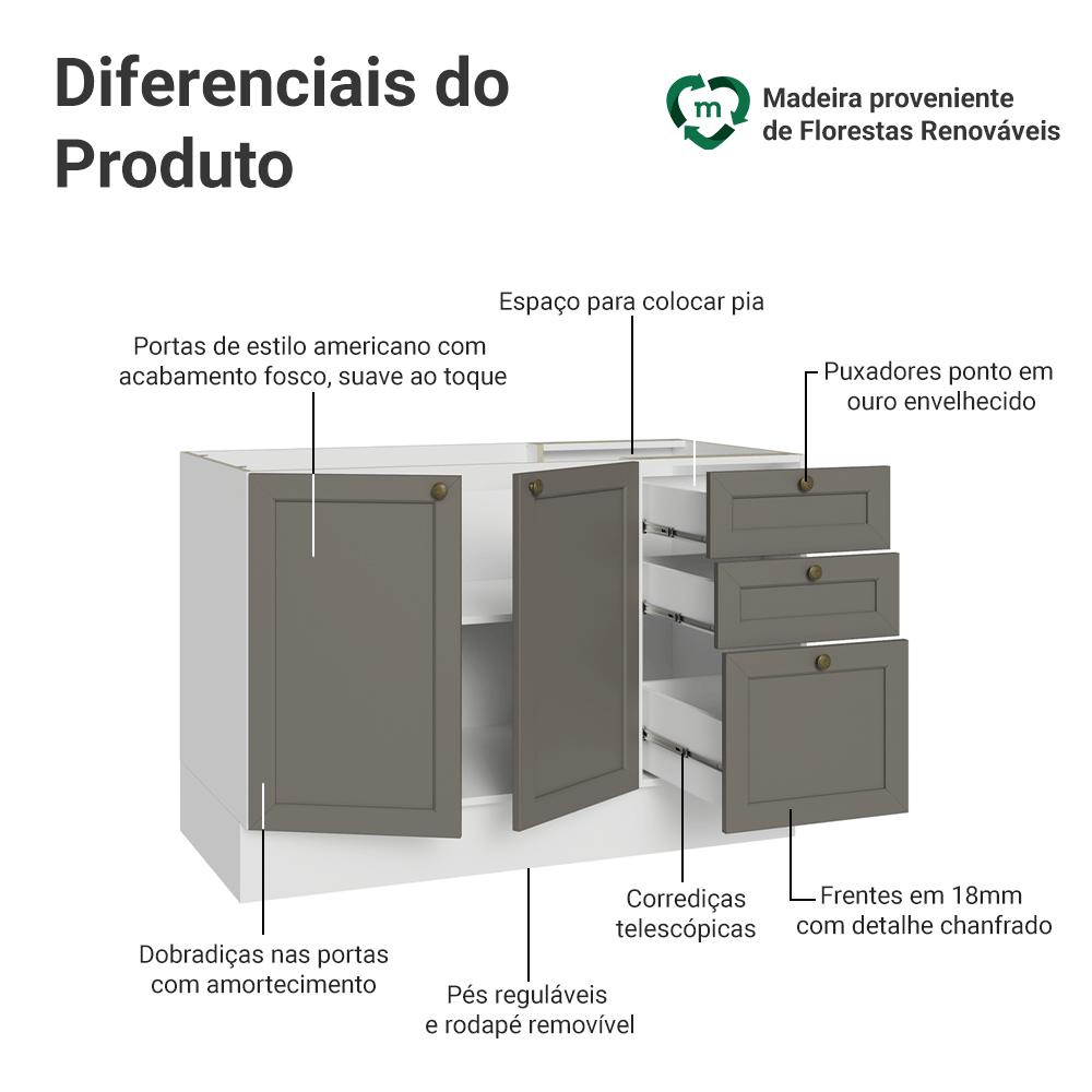 Balcão de Pia 120 cm 2 Portas 3 Gavetas (Sem Tampo) Branco/Cinza Vik Madesa