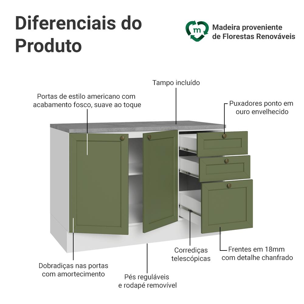 Balcão de Cozinha 120 cm 2 Portas 3 Gavetas Branco/Verde Vik Madesa