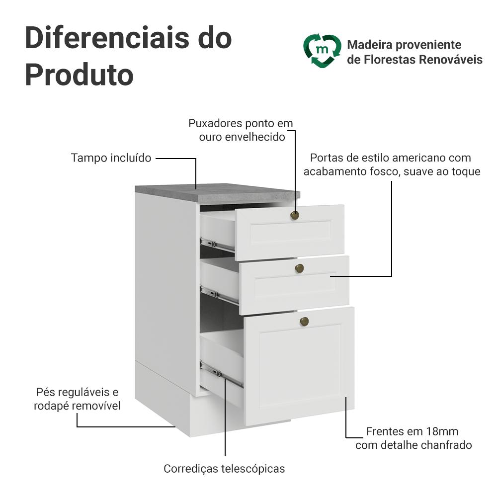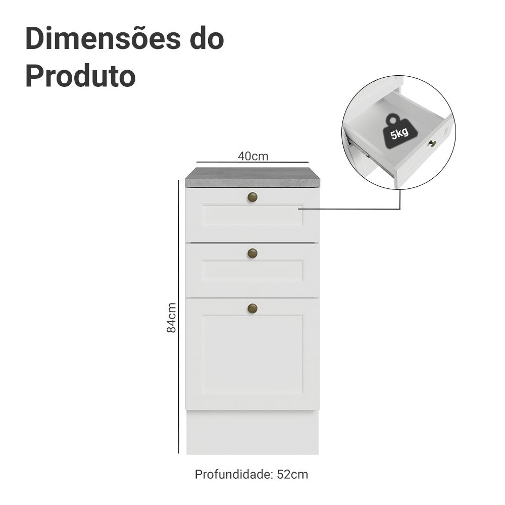 Balcão de Cozinha 40 cm 3 Gavetas Branco Vik Madesa