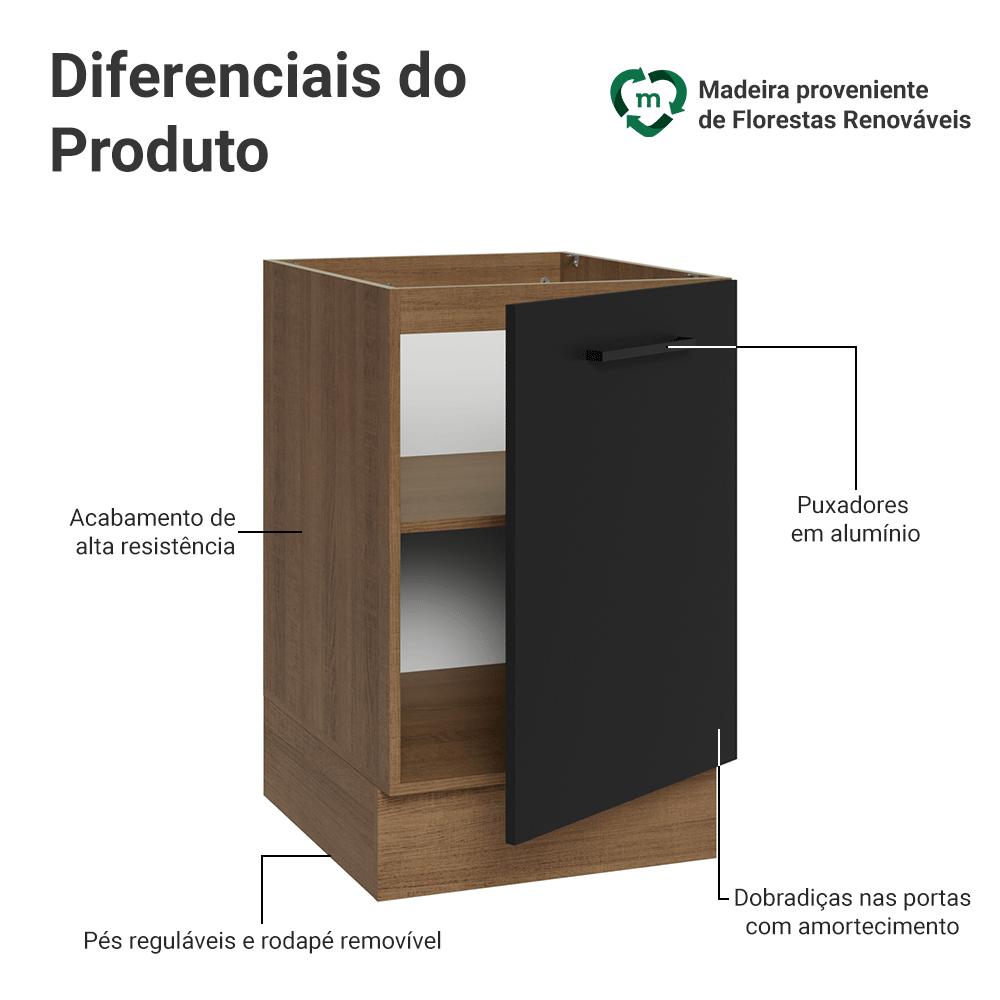 O balcão de 50 cm da linha Agata é a solução ideal para quem precisa de mais organização na cozinha, com uma porta e espaço interno bem distribuído.O móvel possui dobradiças metálicas com amortecimento, garantindo um fechamento suave e silencioso, possui pés reguláveis e o rodapé removível facilita a limpeza.O acabamento da estrutura é no tom amadeirado Rustic e a porta em preto, transmitindo um design marcante e sofisticado. O destaque fica por conta do puxador, o design em alça garante praticidade e valoriza ainda mais o móvel.Importante: este balcão é vendido sem tampo, perfeito para quem deseja personalizar o acabamento.Medidas totais:- 81 cm de altura- 50 cm de largura- 52 cm de profundidadeInformações técnicas:- Material: MDP- Peso suportado: 40kg- Altura dos pés: reguláveis de 15cm a 20cm O que você recebe:- Um Balcão de 50cm com uma porta (Não acompanha tampo)Código do produto: G245077KAGSTÉ importante saber:- Imagens meramente ilustrativas, a decoração não acompanha o produto- A Madesa não disponibiliza serviço de montagem- O produto segue com manual de instalação e todas as ferragens necessárias para sua montagemA Madesa possui compromisso com a sustentabilidade. Geramos energia limpa em nossa própria usina, priorizamos fornecedores responsáveis e utilizamos plástico reciclado em nossa produção. Além disso, reinserimos sobras no ciclo de reciclagem e investimos no desenvolvimento de nossos colaboradores e da comunidade.Garantia: Este produto conta com 1 ano de garantia total, sendo 3 meses de garantia legal e 9 meses de garantia contratual. A garantia cobre exclusivamente defeitos de fabricação e vícios ocultos. Não estão cobertos: problemas decorrentes de montagem incorreta, uso inadequado, exposição à umidade, calor ou luz solar direta, modificações no produto ou desgaste natural.