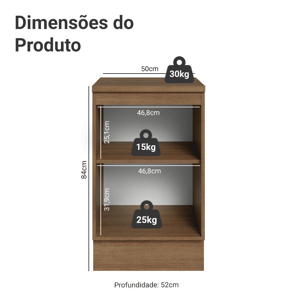 O Balcão de 50 cm da linha Vik foi criado para quem busca uma cozinha que une beleza e praticidade.O acabamento de alta resistência da estrutura é no tom amadeirado Rustic e da porta em Azul. Possui uma textura suave ao toque, trazendo leveza e sofisticação ao ambiente. O destaque fica por conta do puxador ponto em ouro envelhecido, feito com metal resistente, traz um charme único. Outro diferencial está no detalhe chanfrado das frentes, que forma molduras elegantes e dá profundidade ao design, refletindo o estilo americano com um toque moderno.Além de trazer elegância, a linha Vik é funcional em cada detalhe. As portas possuem dobradiças com amortecimento, garantindo um fechamento suave e silencioso.Medidas totais:- 84 cm de altura- 50 cm de largura- 52 cm de profundidadeInformações técnicas:- Material: MDP- Peso suportado: 70kg- Altura dos pés: reguláveis de 15cm a 20cmO que você recebe:- Um Balcão de 50cm com uma portaCódigo do produto: G24507M1VKÉ importante saber:- Imagens meramente ilustrativas, a decoração não acompanha o produto- A Madesa não disponibiliza serviço de montagem- O produto segue com manual de instalação e todas as ferragens necessárias para sua montagemA Madesa possui compromisso com a sustentabilidade. Geramos energia limpa em nossa própria usina, priorizamos fornecedores responsáveis e utilizamos plástico reciclado em nossa produção. Além disso, reinserimos sobras no ciclo de reciclagem e investimos no desenvolvimento de nossos colaboradores e da comunidade.Garantia: Este produto conta com 1 ano de garantia total, sendo 3 meses de garantia legal e 9 meses de garantia contratual. A garantia cobre exclusivamente defeitos de fabricação e vícios ocultos. Não estão cobertos: problemas decorrentes de montagem incorreta, uso inadequado, exposição à umidade, calor ou luz solar direta, modificações no produto ou desgaste natural.