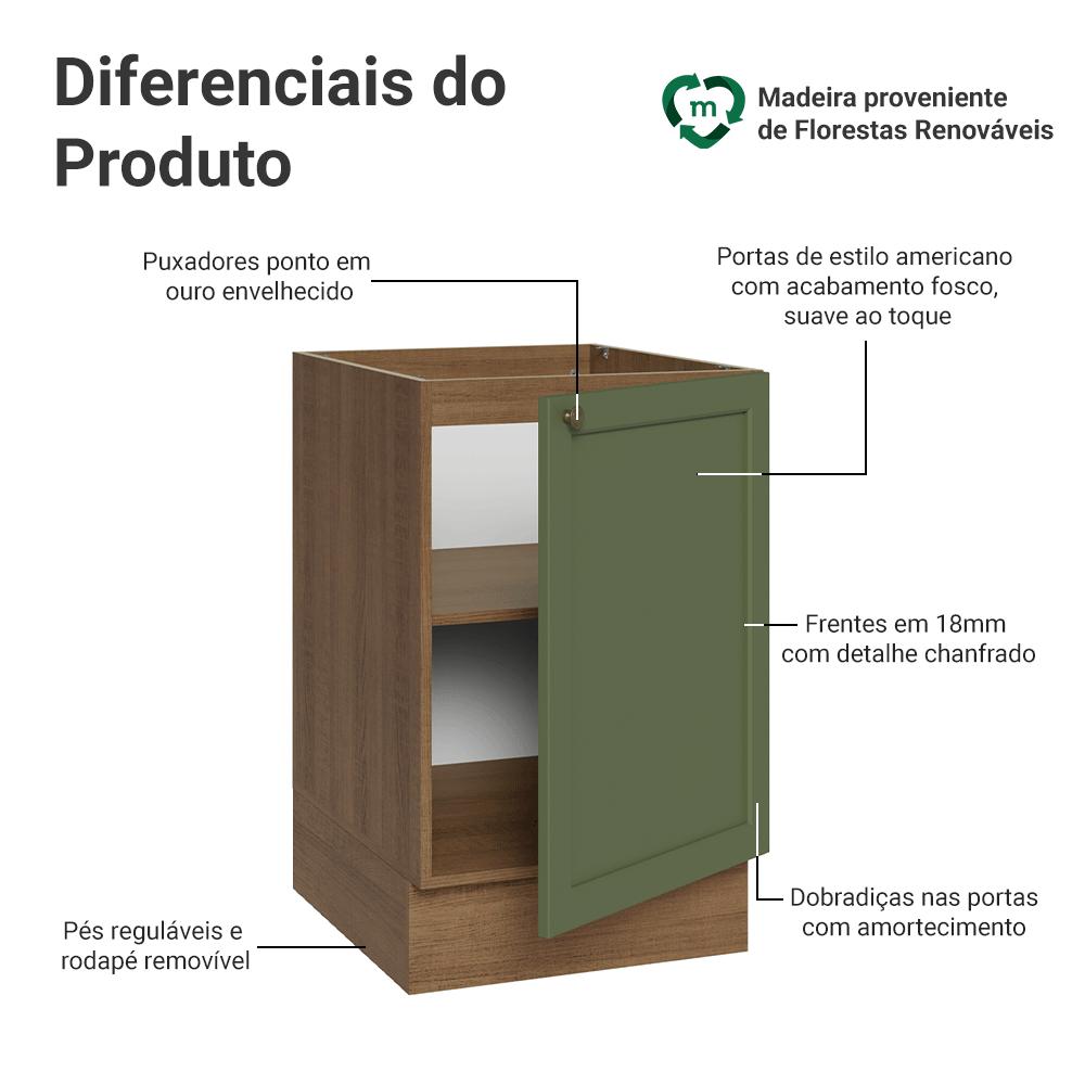 O Balcão de 50 cm da linha Vik foi criado para quem busca uma cozinha que une beleza e praticidade.O acabamento da estrutura é no tom amadeirado Rustic e da porta em Verde, com uma textura suave ao toque. Possui puxadores ponto em ouro envelhecido que trazem um charme único. Outro diferencial está no detalhe chanfrado das frentes, que forma molduras elegantes e dá profundidade ao design, refletindo o estilo americano.Além de trazer elegância, a linha Vik é funcional em cada detalhe. As portas possuem dobradiças com amortecimento, garantindo um fechamento suave e silencioso.Importante: este balcão é vendido sem tampo, perfeito para quem deseja personalizar o acabamento.Medidas totais:- 81 cm de altura- 50 cm de largura- 52 cm de profundidadeInformações técnicas:- Material: MDP- Peso suportado: 40kg- Altura dos pés: reguláveis de 15cm a 20cmO que você recebe:- Um Balcão de 50cm com uma porta (Não acompanha tampo)Código do produto: G24507M3VKSTÉ importante saber:- Imagens meramente ilustrativas, a decoração não acompanha o produto- A Madesa não disponibiliza serviço de montagem- O produto segue com manual de instalação e todas as ferragens necessárias para sua montagemA Madesa possui compromisso com a sustentabilidade. Geramos energia limpa em nossa própria usina, priorizamos fornecedores responsáveis e utilizamos plástico reciclado em nossa produção. Além disso, reinserimos sobras no ciclo de reciclagem e investimos no desenvolvimento de nossos colaboradores e da comunidade.Garantia: Este produto conta com 1 ano de garantia total, sendo 3 meses de garantia legal e 9 meses de garantia contratual. A garantia cobre exclusivamente defeitos de fabricação e vícios ocultos. Não estão cobertos: problemas decorrentes de montagem incorreta, uso inadequado, exposição à umidade, calor ou luz solar direta, modificações no produto ou desgaste natural.