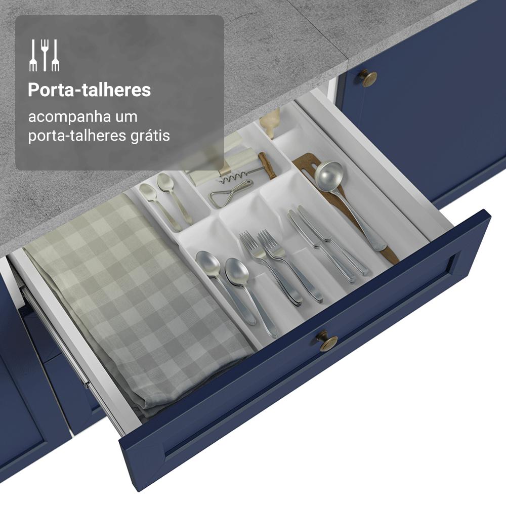 O Balcão de Cozinha com 3 Gavetas da Linha Vik da Madesa é a escolha ideal para quem deseja mais organização na sua cozinha. Com três gavetas amplas, sendo a última mais profunda – ideal para guardar panelas ou itens maiores. Todas as gavetas contam com corrediças telescópicas, que oferecem abertura total e muito mais facilidade no dia a dia.O acabamento de alta resistência da estrutura é em Branco e das gavetas em Azul. Possui uma textura suave ao toque, trazendo leveza e sofisticação ao ambiente. O destaque fica por conta dos puxadores ponto em ouro envelhecido, feitos com metal resistente, trazem personalidade e um charme único. Outro diferencial está no detalhe chanfrado das frentes, que forma molduras elegantes e dá profundidade ao design, refletindo o estilo americano com um toque moderno.Além de trazer elegância, a linha Vik é funcional em cada detalhe. As portas possuem dobradiças com amortecimento, garantindo um fechamento suave e silencioso. Cada detalhe foi pensado para tornar sua casa mais elegante e funcional.Medidas totais:- 84 cm de altura- 60 cm de largura- 52 cm de profundidadeItens inclusos:- Um (1) Balcão com três (3) gavetas (Acompanha o tampo)Código do produto: G24601L8VKObs.:- Imagens meramente ilustrativas, a decoração não acompanha o produto- A Madesa não disponibiliza serviço de montagem- O produto segue com manual de instalação e todas as ferragens necessárias para sua montagemA Madesa se dedica à sustentabilidade com várias iniciativas: temos uma usina própria que gera energia para uma das fábricas. Priorizamos fornecedores responsáveis com o meio ambiente. Todo o plástico utilizado na produção é reciclado, e as sobras também são reaproveitadas. Investimos no desenvolvimento de nossos colaboradores e em ações que beneficiem a comunidade.