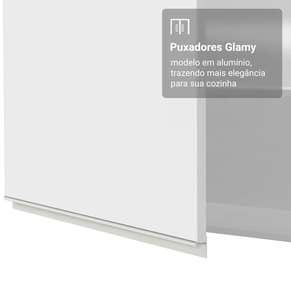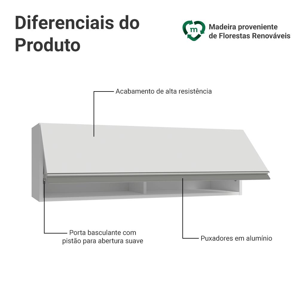 O armário aéreo com porta basculante da linha Glamy combina funcionalidade e um visual moderno para deixar a cozinha ainda mais prática.O acabamento totalmente branco acrescenta leveza ao visual e combina com qualquer estilo de decoração. O puxador cinza em perfil de alumínio, no estilo cava, completa o design com um toque moderno e discreto.A porta basculante oferece acesso fácil e conta com sistema de pistão a gás,que mantém a porta suspensa quando está aberta, garantindo conforto no dia a dia.Medidas totais:- 33 cm de altura- 100 cm de largura- 31 cm de profundidadeInformações técnicas:- Material: MDP- Peso suportado: 10kgO que você recebe:- Um Armário Aéreo com porta basculanteCódigo do produto: G2510209GLÉ importante saber:- Imagens meramente ilustrativas, a decoração não acompanha o produto- A Madesa não disponibiliza serviço de montagem- O produto segue com manual de instalação e todas as ferragens necessárias para sua montagemA Madesa possui compromisso com a sustentabilidade. Geramos energia limpa em nossa própria usina, priorizamos fornecedores responsáveis e utilizamos plástico reciclado em nossa produção. Além disso, reinserimos sobras no ciclo de reciclagem e investimos no desenvolvimento de nossos colaboradores e da comunidade.Garantia: Este produto conta com 1 ano de garantia total, sendo 3 meses de garantia legal e 9 meses de garantia contratual. A garantia cobre exclusivamente defeitos de fabricação e vícios ocultos. Não estão cobertos: problemas decorrentes de montagem incorreta, uso inadequado, exposição à umidade, calor ou luz solar direta, modificações no produto ou desgaste natural.