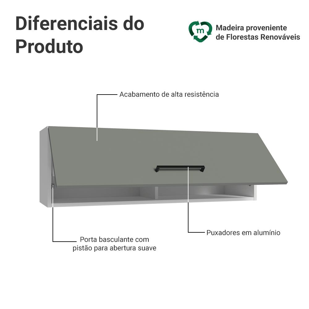 O armário aéreo com porta basculante da linha Agata é a escolha perfeita para quem busca praticidade para sua cozinha.O acabamento da estrutura em branco com a porta em Cinza cria um visual moderno. Um dos grandes destaques da linha está nos puxadores em formato alça, que entregam um visual elegante e moderno. Além de valorizar o design do móvel, eles garantem mais praticidade no uso diário.A porta basculante conta com sistema de pistão a gás, que a mantém suspensa quando está aberta, garantindo mais segurança e praticidade. É a solução ideal para manter tudo ao alcance das mãos.Medidas totais:- 33 cm de altura- 100 cm de largura- 31 cm de profundidadeInformações técnicas:- Material: MDP- Peso suportado: 10kgO que você recebe:- Um Armário Aéreo com porta basculanteCódigo do produto: G25102F8AGÉ importante saber:- Imagens meramente ilustrativas, a decoração não acompanha o produto- A Madesa não disponibiliza serviço de montagem- O produto segue com manual de instalação e todas as ferragens necessárias para sua montagemA Madesa possui compromisso com a sustentabilidade. Geramos energia limpa em nossa própria usina, priorizamos fornecedores responsáveis e utilizamos plástico reciclado em nossa produção. Além disso, reinserimos sobras no ciclo de reciclagem e investimos no desenvolvimento de nossos colaboradores e da comunidade.Garantia: Este produto conta com 1 ano de garantia total, sendo 3 meses de garantia legal e 9 meses de garantia contratual. A garantia cobre exclusivamente defeitos de fabricação e vícios ocultos. Não estão cobertos: problemas decorrentes de montagem incorreta, uso inadequado, exposição à umidade, calor ou luz solar direta, modificações no produto ou desgaste natural.