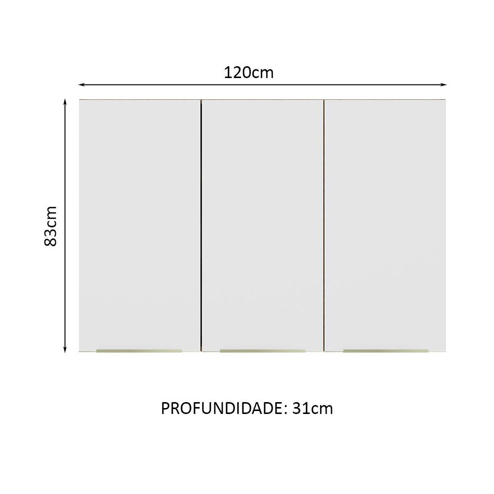 Este Armário Aéreo da linha Lux da Madesa se destaca pela ótima disposição do espaço interno. Perfeito para organizar louças e mantimentos, é desenvolvido com materiais de alta qualidade, como puxadores em alumínio e dobradiças metálicas.Um dos grandes diferenciais desta versão é a porta, que possui revestimento metálico nas bordas e acabamento em Branco Veludo, uma pintura especial e sofisticada, com toque liso e aveludado.O acabamento da estrutura é no padrão amadeirado Rustic e as portas em Branco Veludo. É feito em Pintura Poliéster ecológica, com 7 camadas que protegem o móvel contra os efeitos da água e do calor.Este armário pode ser combinado com outros módulos e com todas as cozinhas da linha Lux da Madesa.(Imagens meramente ilustrativas. O armário precisa ser fixado na parede.)Itens inclusos:- Um (1) aéreo de 83 cm de altura x 120 cm de largura x 31 cm de profundidade com três (3) portas e quatro (4) prateleiras internas.Código do produto: G25142H8LXObs.: A Madesa não disponibiliza serviço de montagem. O produto segue com manual de instalação e todas as ferragens necessárias para sua montagem.A Madesa se dedica à sustentabilidade com várias iniciativas: temos uma usina própria para gerar energia que abastece uma de nossas fábricas. Selecionamos nossos fornecedores, priorizando aqueles que possuem um compromisso com a sustentabilidade e proteção do meio ambiente. Todo o plástico utilizado no setor produtivo é proveniente de reciclagem e as suas sobras são encaminhadas ao fornecedor que os recicla. Também investimos no desenvolvimento contínuo de nossos colaboradores e em ações educacionais que beneficiem a comunidade.