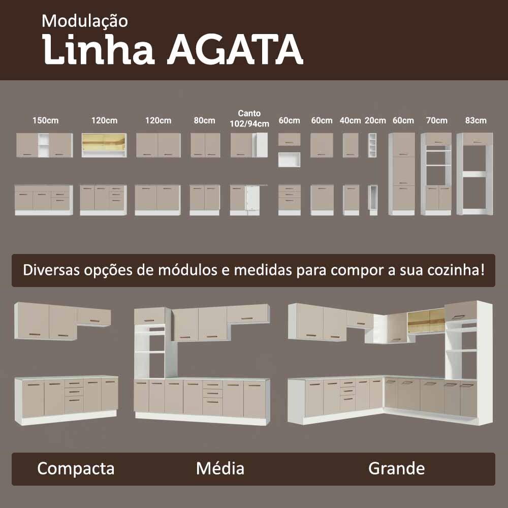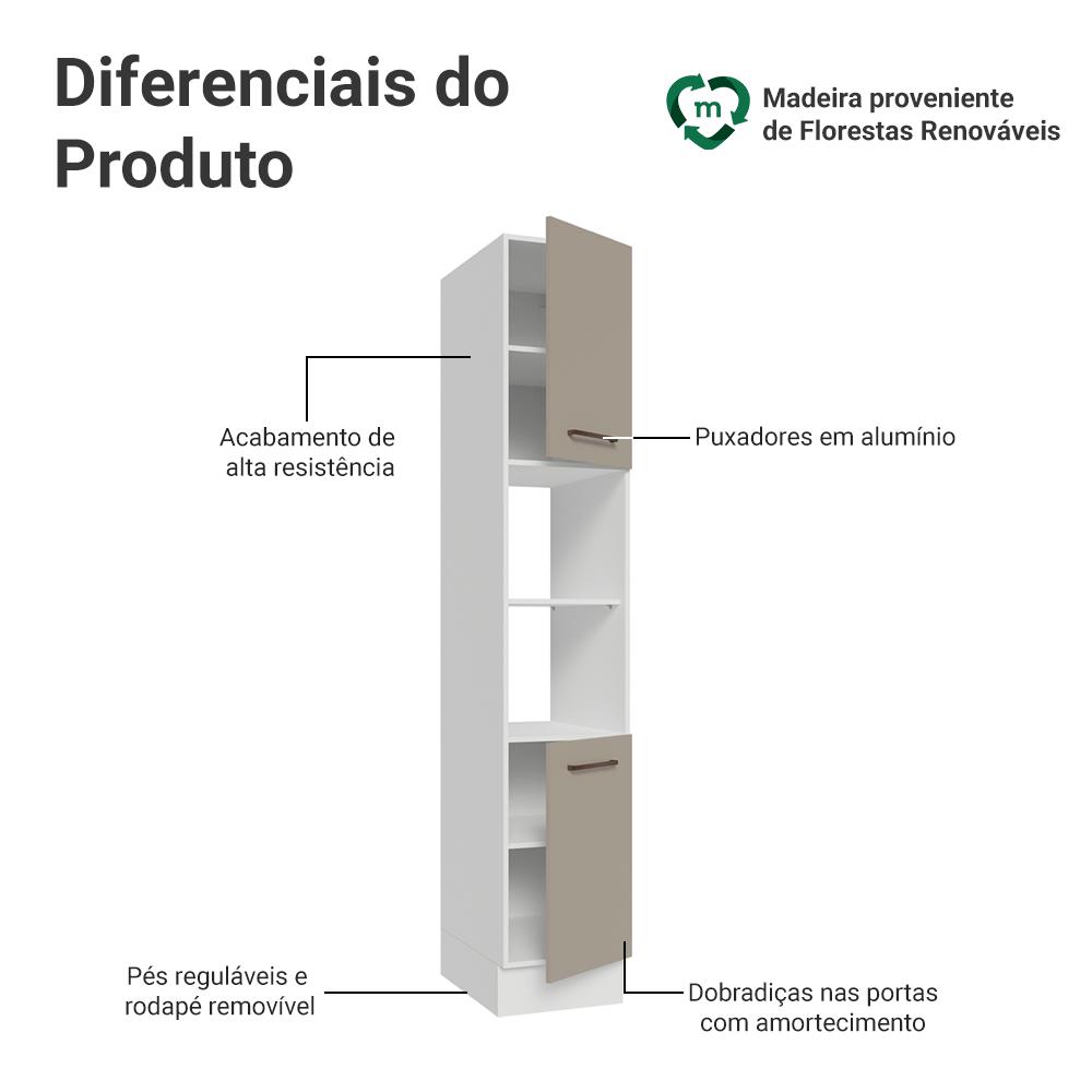 O Paneleiro de 40cm da linha Agata, com duas portas e dois nichos, proporciona praticidade e organização, deixando sua cozinha ainda mais funcional.O acabamento da estrutura em branco, e a porta no tom crema, cria uma composição leve e fácil de combinar. O destaque fica por conta do puxador bronze, que adiciona um toque moderno. O design em alça garante mais praticidade.As portas possuem dobradiças com amortecimento, que proporcionam fechamento suave e silencioso. Os pés possuem regulagem de altura e o rodapé removível facilita a limpeza.Medidas totais:- 225 cm de altura- 40 cm de largura- 52 cm de profundidadeInformações técnicas:- Material: MDP- Peso suportado: 95kg- Altura dos pés: reguláveis de 15cm a 20cmO que você recebe:- Um Paneleiro com duas portas e dois nichosCódigo do produto: G264005LAGÉ importante saber:- Imagens meramente ilustrativas, a decoração não acompanha o produto- A Madesa não disponibiliza serviço de montagem- O produto segue com manual de instalação e todas as ferragens necessárias para sua montagemA Madesa possui compromisso com a sustentabilidade. Geramos energia limpa em nossa própria usina, priorizamos fornecedores responsáveis e utilizamos plástico reciclado em nossa produção. Além disso, reinserimos sobras no ciclo de reciclagem e investimos no desenvolvimento de nossos colaboradores e da comunidade.Garantia: Este produto conta com 1 ano de garantia total, sendo 3 meses de garantia legal e 9 meses de garantia contratual. A garantia cobre exclusivamente defeitos de fabricação e vícios ocultos. Não estão cobertos: problemas decorrentes de montagem incorreta, uso inadequado, exposição à umidade, calor ou luz solar direta, modificações no produto ou desgaste natural.