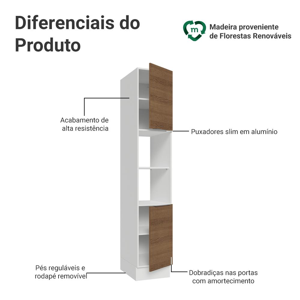 O Paneleiro de 40 cm da linha Stella combina design elegante e funcionalidade. Com duas portas e dois nichos, ele oferece uma solução prática para organizar utensílios, alimentos e outros itens essenciais da sua cozinha, mantendo tudo ao alcance e bem organizado.O acabamento une a estrutura branca com a frente no tom Rustic, um amadeirado que transmite aconchego e personalidade. O puxador slim em alumínio adiciona um toque moderno ao design. Seu formato alongado e discreto valoriza ainda mais o móvel.As portas possuem dobradiças com amortecimento, que proporcionam fechamento suave e silencioso. Os pés possuem regulagem de altura e o rodapé removível facilita a limpeza.Medidas totais:- 225 cm de altura- 40 cm de largura- 52 cm de profundidadeInformações técnicas:- Material: MDP- Peso suportado: 95kg- Altura dos pés: reguláveis de 15cm a 20cmO que você recebe:- Um Paneleiro com duas portas e dois nichosCódigo do produto: G264009BTEÉ importante saber:- Imagens meramente ilustrativas, a decoração não acompanha o produto- A Madesa não disponibiliza serviço de montagem- O produto segue com manual de instalação e todas as ferragens necessárias para sua montagemA Madesa possui compromisso com a sustentabilidade. Geramos energia limpa em nossa própria usina, priorizamos fornecedores responsáveis e utilizamos plástico reciclado em nossa produção. Além disso, reinserimos sobras no ciclo de reciclagem e investimos no desenvolvimento de nossos colaboradores e da comunidade.Garantia: Este produto conta com 1 ano de garantia total, sendo 3 meses de garantia legal e 9 meses de garantia contratual. A garantia cobre exclusivamente defeitos de fabricação e vícios ocultos. Não estão cobertos: problemas decorrentes de montagem incorreta, uso inadequado, exposição à umidade, calor ou luz solar direta, modificações no produto ou desgaste natural.