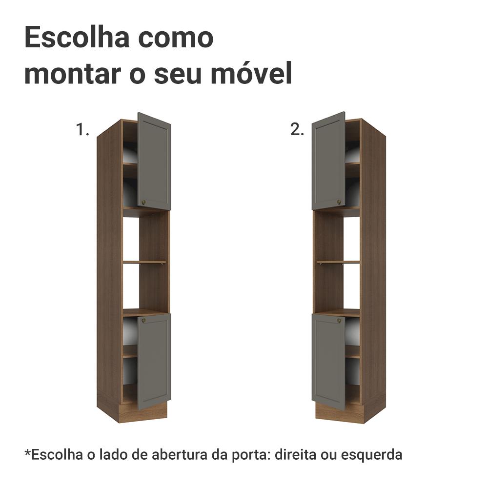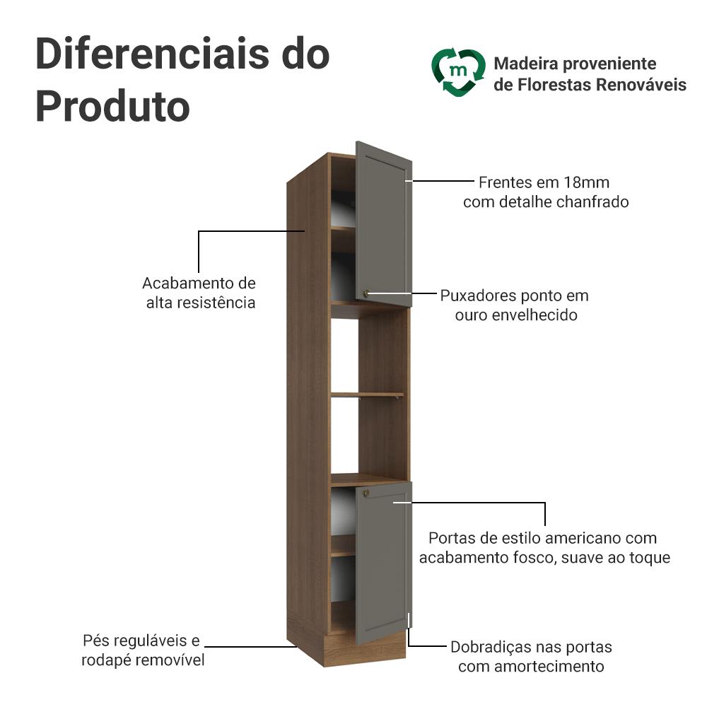 O Paneleiro de 40 cm da linha Vik combina organização e estilo. Com duas portas e dois nichos, ele proporciona praticidade, aproveitando ao máximo cada canto da sua cozinha.O acabamento da estrutura é em tom amadeirado Rustic e das portas em Cinza. Possui uma textura suave ao toque, trazendo sofisticação ao ambiente. O puxador em ouro envelhecido, feito de metal resistente, confere personalidade. O detalhe chanfrado nas frentes cria molduras elegantes, dando profundidade e refletindo o estilo americano com um toque moderno.As portas possuem dobradiças com amortecimento, que proporcionam fechamento suave e silencioso. Os pés possuem regulagem de altura e o rodapé removível facilita a limpeza.Medidas totais:- 225 cm de altura- 40 cm de largura- 52 cm de profundidadeInformações técnicas:- Material: MDP- Peso suportado: 95kg- Altura dos pés: reguláveis de 15cm a 20cmO que você recebe:- Um Paneleiro com duas portas e dois nichosCódigo do produto: G26400F9VKÉ importante saber:- Imagens meramente ilustrativas, a decoração não acompanha o produto- A Madesa não disponibiliza serviço de montagem- O produto segue com manual de instalação e todas as ferragens necessárias para sua montagemA Madesa possui compromisso com a sustentabilidade. Geramos energia limpa em nossa própria usina, priorizamos fornecedores responsáveis e utilizamos plástico reciclado em nossa produção. Além disso, reinserimos sobras no ciclo de reciclagem e investimos no desenvolvimento de nossos colaboradores e da comunidade.Garantia: Este produto conta com 1 ano de garantia total, sendo 3 meses de garantia legal e 9 meses de garantia contratual. A garantia cobre exclusivamente defeitos de fabricação e vícios ocultos. Não estão cobertos: problemas decorrentes de montagem incorreta, uso inadequado, exposição à umidade, calor ou luz solar direta, modificações no produto ou desgaste natural.