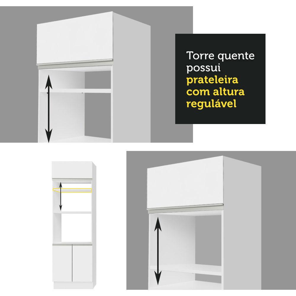 A Torre Quente Madesa Glamy de 70 cm é a opção perfeita para quem procura praticidade, qualidade, beleza e aproveitamento de espaço.Este armário possui duas portas convencionais com dobradiças metálicas e amortecimento e uma porta basculante com pistão a gás, todas com abertura e fechamento suave. O espaço interno conta com uma prateleira e é ideal para armazenar de forma organizada utensílios, louças, eletro portáteis, mantimentos e o que mais você preferir.Sua altura é de armário planejado com 225 cm de altura e possui dois espaços para forno ou microondas de 47 cm x 67 cm com abertura para saída do calor. Os pés são em PVC com regulagem de altura e rodapé removível de madeira de fácil encaixe. Este módulo precisa ser fixado na parede.O acabamento interno e externo é branco, em Pintura Poliéster com 7 camadas protetoras que aumentam a resistência e durabilidade do móvel. A pintura é ecológica, isenta de vapores que vão para a atmosfera.A linha de cozinhas Glamy é totalmente modulada. É possível combinar este armário com outros módulos disponíveis na linha. Inclusive combinando diferentes cores, para você criar a cozinha dos seus sonhos.Imagem meramente ilustrativa. Os eletros e a decoração não acompanham o produto.Itens inclusos:- Uma (1) torre quente de 225 cm de altura x 70 cm de largura x 52 cm de profundidade com duas (2) portas convencionais, uma (1) porta basculante e dois (2) nichos externos.Código do produto: G2675509GLObs.: A Madesa não disponibiliza serviço de montagem. O produto segue com manual de instalação e todas as ferragens necessárias para sua montagem.1-O produto é novo ou usado?R.: Todos os produtos da Madesa são novos, enviados da nossa fábrica diretamente para as casas de nossos clientes.2-O produto vem montado? Se não, vocês realizam a montagem?R.: A Madesa não disponibiliza serviço de montagem. Todos os produtos seguem com manual de instalação e as ferragens necessárias. Alguns produtos possuem vídeo explicando o passo a passo da montagem.3-Vocês possuem loja física? Posso retirar meu produto em mãos?R.: Não possuímos loja física, apenas loja virtual. Confira as opções de envio ao colocar o seu CEP.4-Qual é o valor do envio? Posso pagar separadamente?R.: O valor do envio é calculado com base no peso e volume do produto, e no CEP de destino. Você pode calcular o valor e prazo de entrega no simulador.5-A Madesa entrega em todo Brasil? Como é feita a entrega?R.: Sim, entregamos no Brasil inteiro através de transportadoras parceiras.6-O produto acompanha Nota Fiscal?R.: Sim, todos os produtos são entregues com suas respectivas notas fiscais.7-Os produtos possuem garantia?R.: Sim. A Madesa oferece 3 meses de garantia para defeitos de fabricação.