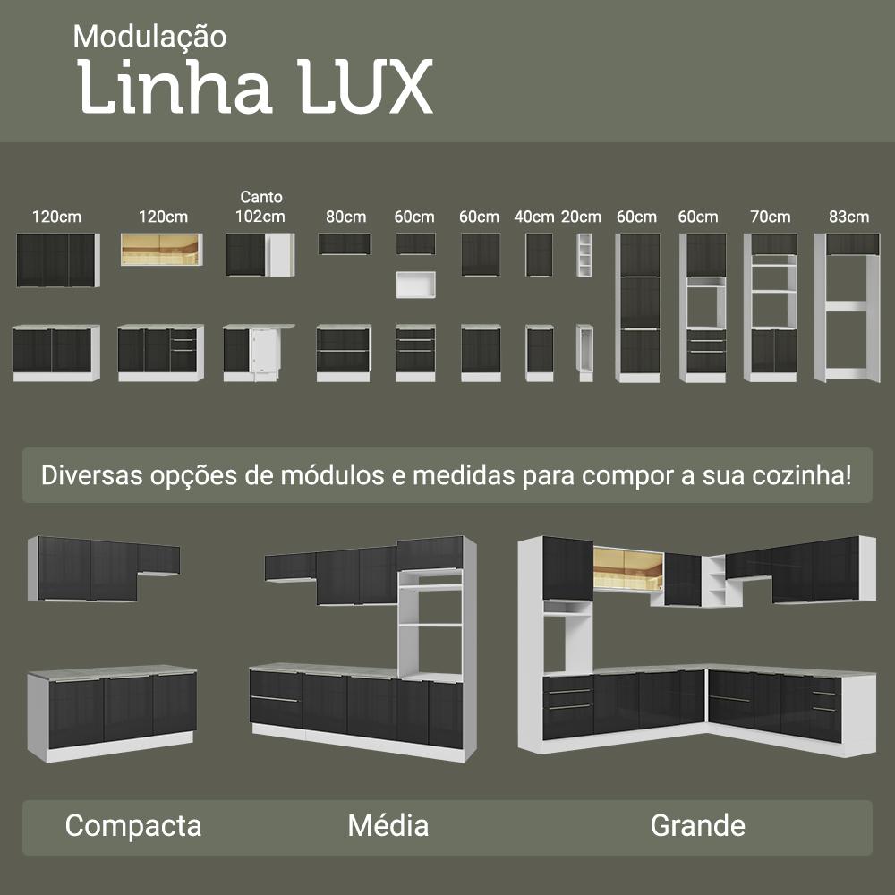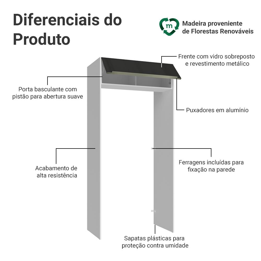 O armário porta-geladeira da linha Lux da Madesa foi desenvolvido para quem busca sofisticação e funcionalidade para a sua cozinha.Este móvel foi projetado para integrar a geladeira ao ambiente de maneira eficiente, aproveitando melhor o espaço e trazendo mais organização para a cozinha. Um dos grandes diferenciais da linha são os puxadores reforçados com acabamento em aço escovado na cor champagne.A porta basculante, equipada com pistão a gás, mantém-se suspensa quando aberta, oferecendo mais segurança e praticidade no uso diário. O acabamento branco com preto, aliado às portas com vidro sobreposto, resulta em uma composição marcante e elegante, perfeita para cozinhas modernas e cheias de personalidade.Medidas:- 225cm de altura- 103cm de largura- 29cm de profundidade no aéreo e 60cm no porta-geladeiraInformações técnicas:- Material: MDP- Peso total suportado: 5 kgO que você recebe:- Um Armário Porta-Geladeira com Aéreo de porta basculanteCódigo do produto: G2710173LXÉ importante saber:- Imagens meramente ilustrativas, a decoração não acompanha o produto.- A Madesa não oferece serviço de montagem.- O produto segue com manual e todas as ferragens necessárias.A Madesa possui compromisso com a sustentabilidade. Geramos energia limpa em nossa própria usina, priorizamos fornecedores responsáveis e utilizamos plástico reciclado em nossa produção. Além disso, reinserimos sobras no ciclo de reciclagem e investimos no desenvolvimento de nossos colaboradores e da comunidade.Garantia: Este produto conta com 1 ano de garantia total, sendo 3 meses de garantia legal e 9 meses de garantia contratual. A garantia cobre exclusivamente defeitos de fabricação e vícios ocultos. Não estão cobertos: problemas decorrentes de montagem incorreta, uso inadequado, exposição à umidade, calor ou luz solar direta, modificações no produto ou desgaste natural.