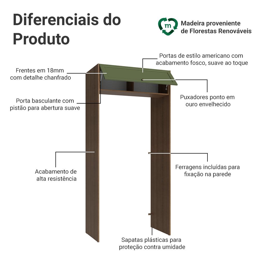 Aproveite ao máximo o espaço da sua cozinha com o porta-geladeira da linha Vik da Madesa.Inspirada no estilo americano, as frentes das portas contam com molduras que trazem profundidade ao design e realçam o acabamento, conferindo um visual sofisticado. Os puxadores ponto em ouro envelhecido adicionam charme, completando o design da linha Vik.O acabamento do móvel conta com textura suave ao toque, que valoriza o visual sofisticado da linha. O acabamento amadeirado Rustic com verde cria um visual marcante e elegante. A porta basculante com sistema de pistão a gás mantém a porta suspensa quando aberta, proporcionando mais praticidade e segurança para o uso diário.Medidas:- 225cm de altura- 103cm de largura- 29cm de profundidade no aéreo e 60cm no porta-geladeiraInformações técnicas:- Material: MDP- Peso total suportado: 5 kgO que você recebe:- Um Armário Porta-Geladeira com Aéreo de porta basculanteCódigo do produto: G27101M3VKÉ importante saber:- Imagens meramente ilustrativas, a decoração não acompanha o produto.- A Madesa não oferece serviço de montagem.- O produto segue com manual e todas as ferragens necessárias.A Madesa possui compromisso com a sustentabilidade. Geramos energia limpa em nossa própria usina, priorizamos fornecedores responsáveis e utilizamos plástico reciclado em nossa produção. Além disso, reinserimos sobras no ciclo de reciclagem e investimos no desenvolvimento de nossos colaboradores e da comunidade.Garantia: Este produto conta com 1 ano de garantia total, sendo 3 meses de garantia legal e 9 meses de garantia contratual. A garantia cobre exclusivamente defeitos de fabricação e vícios ocultos. Não estão cobertos: problemas decorrentes de montagem incorreta, uso inadequado, exposição à umidade, calor ou luz solar direta, modificações no produto ou desgaste natural.