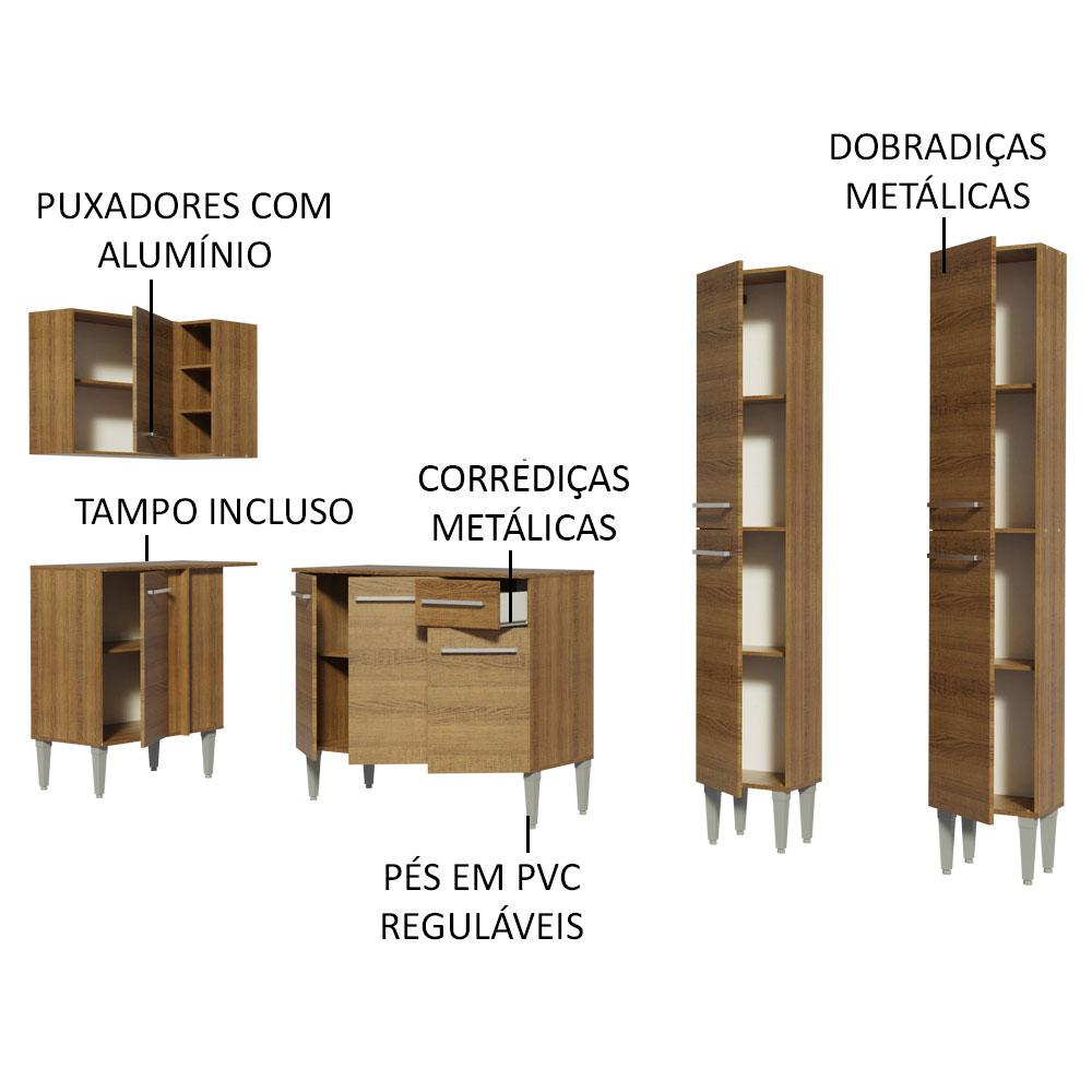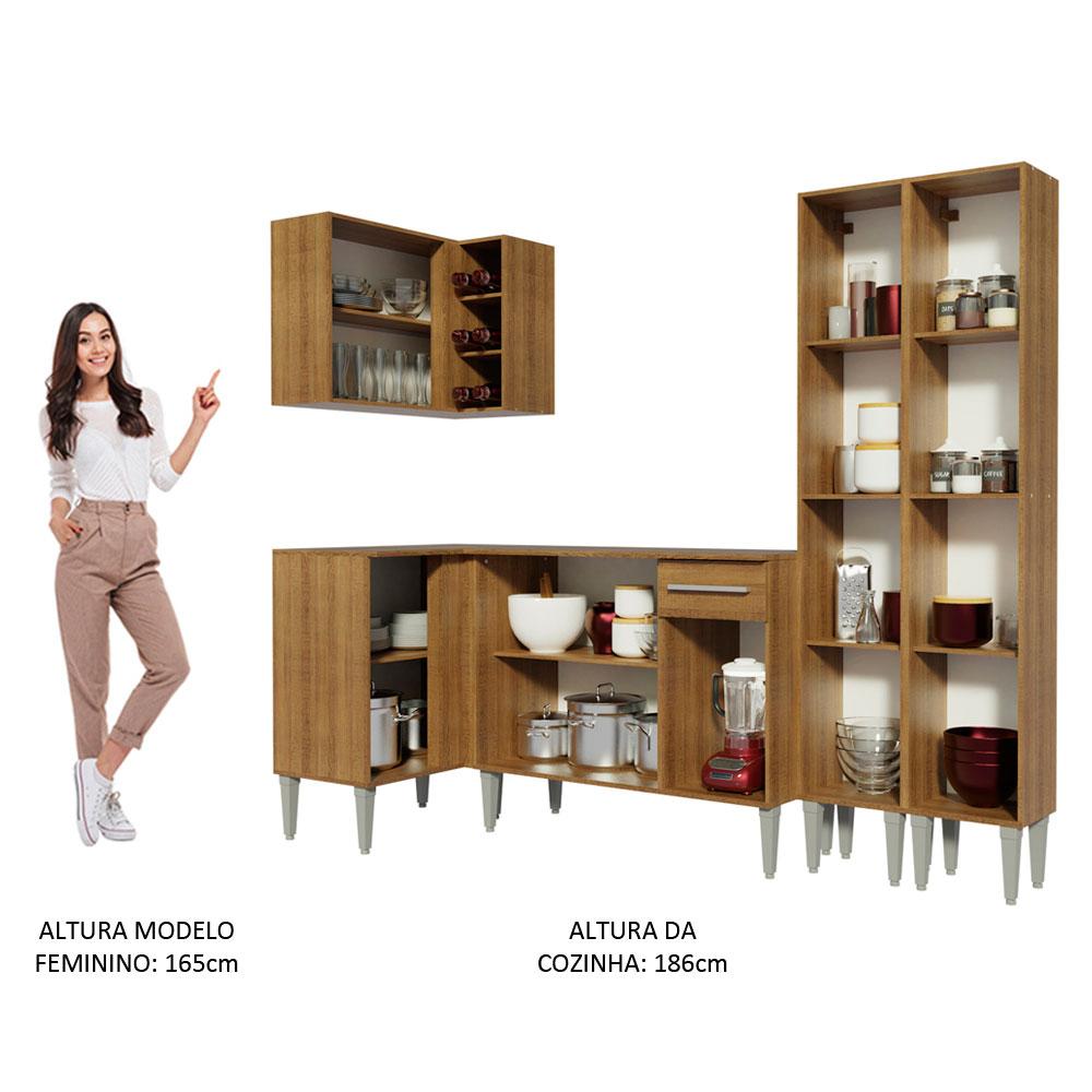 Pensada para ser uma solução completa, a Cozinha Emilly Music de Canto Reto contempla três balcões, dois armários aéreos e uma adega acoplada, todos com ótimo aproveitamento dos espaços. Assim, fica mais fácil organizar os utensílios, louças e eletros. Além disso, todos os módulos são separados, possibilitando a montagem conforme a necessidade do seu ambiente.A cozinha conta com itens de qualidade superior, como puxadores com detalhe em alumínio e corrediças e dobradiças metálicas resistentes. Os pés são em PVC, pensados para facilitar a limpeza e com regulagem que permite nivelar pequenas imperfeições no piso. Para completar, todos os balcões acompanham tampo em MDP.O acabamento é no padrão amadeirado Rustic, em Pintura Poliéster ecológica com 7 camadas de proteção, que oferecem resistência contra os efeitos da água e do calor.Os armários aéreos e o paneleiro precisam ser fixados na parede.Medidas totais: 186 cm de altura x 293 cm de largura x 44 cm profundidade nos balcões e 27 cm no aéreo e no paneleiro.Imagens meramente ilustrativas: a decoração não acompanha o produto.Itens inclusos:- Um (1) Armário aéreo de canto com uma (1) porta e uma (1) adega acoplada- Um (1) Balcão de canto com uma (1) portas e tampo- Um (1) Balcão com três (3) portas, uma (1) gaveta e tampo- Um (1) Paneleiro com duas (2) portasCódigo do produto: GCEM2930025ZObs.: A Madesa não disponibiliza serviço de montagem. O produto segue com manual de instalação e todas as ferragens necessárias para sua montagem.1 – O produto é novo ou usado?R.: Todos os produtos da Madesa são novos, enviados da nossa fábrica diretamente para as casas de nossos clientes.2 – O produto vem montado? Se não, vocês realizam a montagem?R.: A Madesa não disponibiliza serviço de montagem. Todos os produtos seguem com manual de instalação e as ferragens necessárias. Alguns produtos possuem vídeo explicando o passo a passo da montagem.3 – Vocês possuem loja física? Posso retirar meu produto em mãos?R.: Não possuímos loja física, apenas loja virtual. Confira as opções de envio ao colocar o seu CEP.4 – Qual é o valor do envio? Posso pagar separadamente?R.: O valor do envio é calculado com base no peso e volume do produto, e no CEP de destino. Você pode calcular o valor e prazo de entrega no simulador.5 – A Madesa entrega em todo Brasil? Como é feita a entrega?R.: Sim, entregamos no Brasil inteiro através de transportadoras parceiras.6 – O produto acompanha Nota Fiscal?R.: Sim, todos os produtos são entregues com suas respectivas notas fiscais.7 – Os produtos possuem garantia?R.: Sim. A Madesa oferece 3 meses de garantia para defeitos de fabricação.A Madesa se dedica à sustentabilidade com várias iniciativas: temos uma usina própria para gerar energia que abastece uma de nossas fábricas. Selecionamos nossos fornecedores, priorizando aqueles que possuem um compromisso com a sustentabilidade e proteção do meio ambiente. Todo o plástico utilizado no setor produtivo é proveniente de reciclagem e as suas sobras são encaminhadas ao fornecedor que os recicla. Também investimos no desenvolvimento contínuo de nossos colaboradores e em ações educacionais que beneficiem a comunidade.