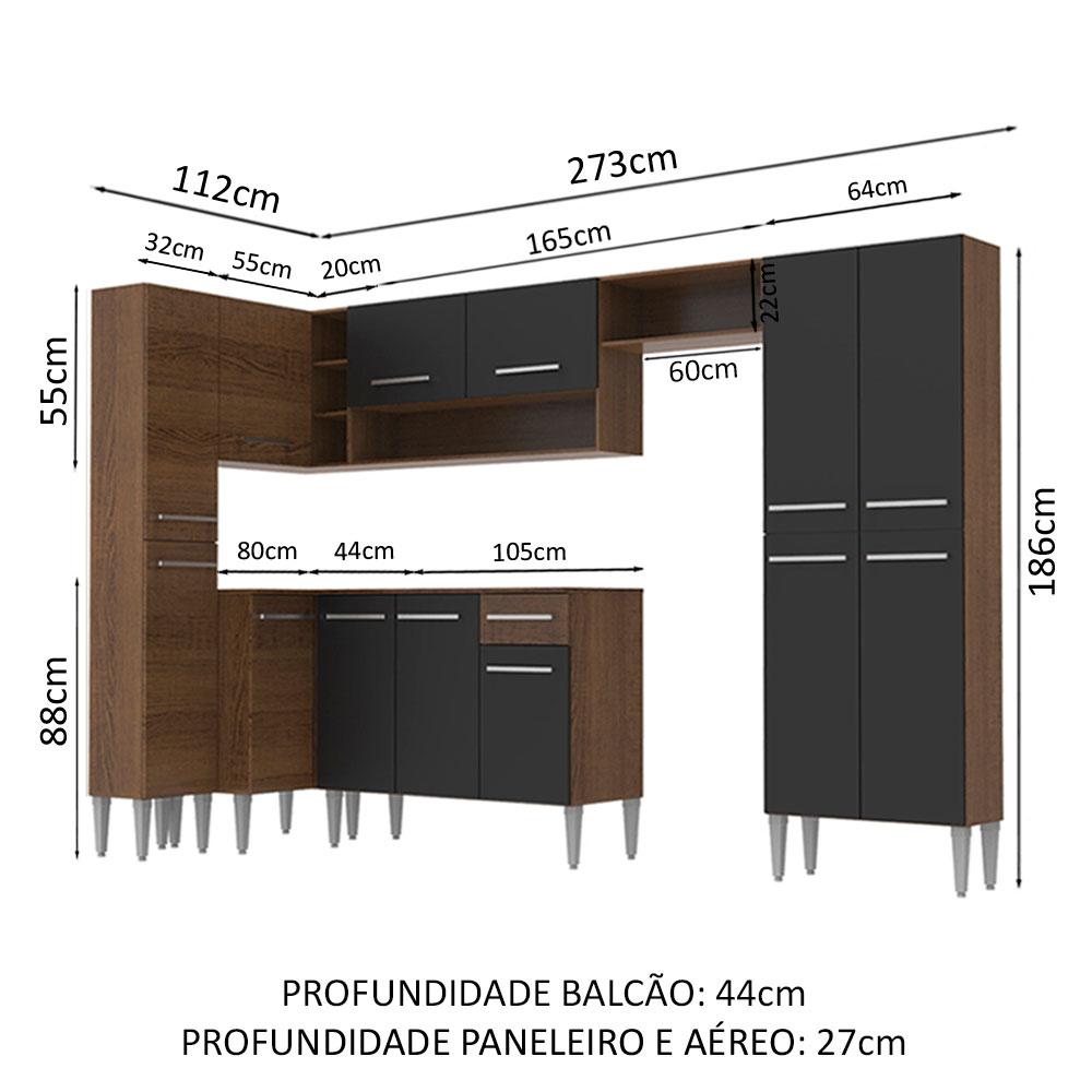 A Cozinha Emilly de Canto Reto se destaca por ser completa e ideal para o seu dia-a-dia. Conta com 13 portas, 1 gaveta e 5 nichos com puxadores com alumínio e corrediças e dobradiças metálicas resistentes. Acompanha tampo de madeira de todos os balcões. Os pés são em PVC para facilitar a limpeza e reguláveis para nivelar pequenas imperfeições no piso.O acabamento é nas cores preto e amadeirado Rustic, em Pintura Poliéster com 7 camadas de proteção que oferecem resistência contra os efeitos da água e do calor. Ela é dividida em seis módulos independentes: paneleiro com duas portas, balcão de canto reto, armário aéreo de canto reto com duas portas e adega, balcão de pia, armário aéreo com duas portas e dois nichos e paneleiro duplo com quatro portas.Os armários aéreos precisam ser fixados na parede. Os módulos de canto devem ser instalados conforme mostram as imagens, não sendo possível fazer a inversão do lado da montagem.Medidas totais: 186 cm de altura, 112 cm de largura do lado esquerdo e 273 cm de largura do lado direito, contabilizando o espaço necessário para o canto. São 44 cm profundidade nos balcões inferiores e 27 cm no paneleiro e nos aéreos.Imagem meramente ilustrativa: a decoração e o fogão não acompanham o produto.Itens inclusos:- Um (1) paneleiro com 2 portas- Um (1) balcão de canto reto com 1 porta e tampo- Um (1) armário aéreo de canto reto com 1 porta e adega acoplada- Um (1) balcão de pia com 3 portas, 1 gaveta e tampo- Um (1) armário aéreo com 2 portas e 2 nichos grandes- Um (1) paneleiro duplo com 4 portasCódigo do produto: GCEM3850017KObs.: A Madesa não disponibiliza serviço de montagem. O produto segue com manual de instalação e todas as ferragens necessárias para sua montagem.1-O produto é novo ou usado?R.: Todos os produtos da Madesa são novos, enviados da nossa fábrica diretamente para as casas de nossos clientes.2-O produto vem montado? Se não, vocês realizam a montagem?R.: A Madesa não disponibiliza serviço de montagem. Todos os produtos seguem com manual de instalação e as ferragens necessárias. Alguns produtos possuem vídeo explicando o passo a passo da montagem.3-Vocês possuem loja física? Posso retirar meu produto em mãos?R.: Não possuímos loja física, apenas loja virtual. Confira as opções de envio ao colocar o seu CEP.4-Qual é o valor do envio? Posso pagar separadamente?R.: O valor do envio é calculado com base no peso e volume do produto, e no CEP de destino. Você pode calcular o valor e prazo de entrega no simulador.5-A Madesa entrega em todo Brasil? Como é feita a entrega?R.: Sim, entregamos no Brasil inteiro através de transportadoras parceiras.6-O produto acompanha Nota Fiscal?R.: Sim, todos os produtos são entregues com suas respectivas notas fiscais.7-Os produtos possuem garantia?R.: Sim. A Madesa oferece 3 meses de garantia para defeitos de fabricação.A Madesa se dedica à sustentabilidade com várias iniciativas: temos uma usina própria para gerar energia que abastece uma de nossas fábricas. Selecionamos nossos fornecedores, priorizando aqueles que possuem um compromisso com a sustentabilidade e proteção do meio ambiente. Todo o plástico utilizado no setor produtivo é proveniente de reciclagem e as suas sobras são encaminhadas ao fornecedor que os recicla. Também investimos no desenvolvimento contínuo de nossos colaboradores e em ações educacionais que beneficiem a comunidade.