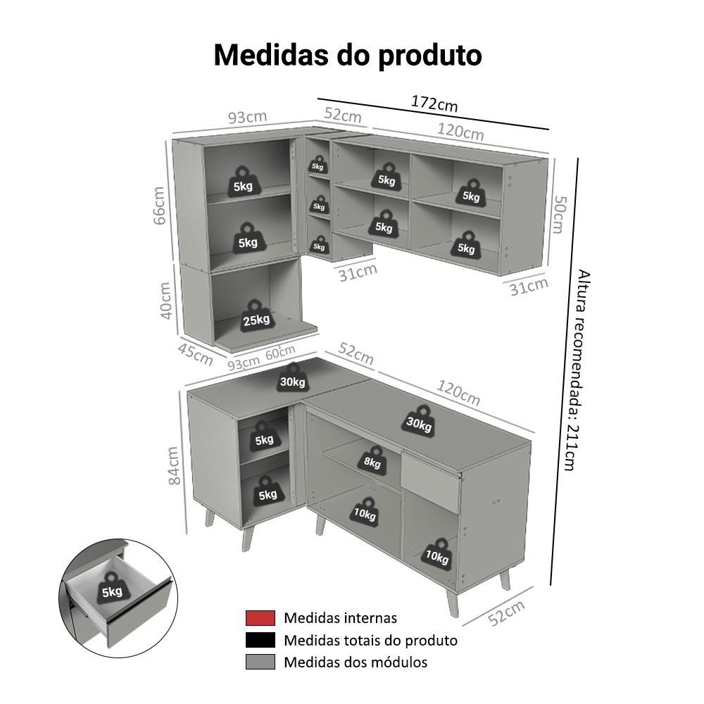 A Cozinha de Canto é perfeita para quem busca otimização de espaço e funcionalidade. Um dos destaques é o aéreo com adega acoplada, ideal para aproveitar ainda mais o espaço. Além disso, conta com um nicho para módulo de forno, garantindo praticidade.O acabamento cinza, uma tonalidade sofisticada e atemporal, transmite modernidade. Os puxadores e os pés na coloração titanium são detalhes que valorizam o design trazendo um toque contemporâneo.Produzido com materiais de qualidade, o balcão possui dobradiças metálicas nas portas e puxadores em perfil de alumínio, garantindo resistência. As gavetas possuem corrediças que permitem abertura total. O tampo é removível, possibilitando a instalação de cuba ou pedra e o acabamento é de alta resistência, garantindo durabilidade no uso diário.Medidas totais:- 211 cm de altura- 265 cm de largura- 52 cm de profundidade nos balcões, 31 cm nos aéreos e 45 cm no nicho para micro-ondasO que você recebe:- Um Armário Aéreo de 120 cm com duas portas- Um Nicho aéreo de 60 cm com espaço para forno- Um Armário Aéreo de canto com adega acomplada- Um Balcão de 120 cm com três portas e uma gaveta- Um Balcão de canto com uma portaCódigo do produto: GCNC2650053BÉ importante saber:- Material: MDP- A Madesa não oferece serviço de montagem.- O produto segue com manual e todas as ferragens necessárias.- Imagens meramente ilustrativas, a decoração não acompanha o produto.- O canto pode ser montado tanto para o lado esquerdo quanto para o lado direito.A Madesa se dedica à sustentabilidade com várias iniciativas: temos uma usina própria que gera energia para uma das fábricas. Priorizamos fornecedores responsáveis com o meio ambiente. Todo o plástico utilizado na produção é reciclado, e as sobras também são reaproveitadas. Investimos no desenvolvimento de nossos colaboradores e em ações que beneficiem a comunidade.